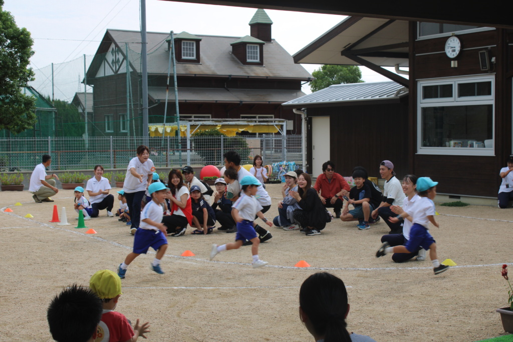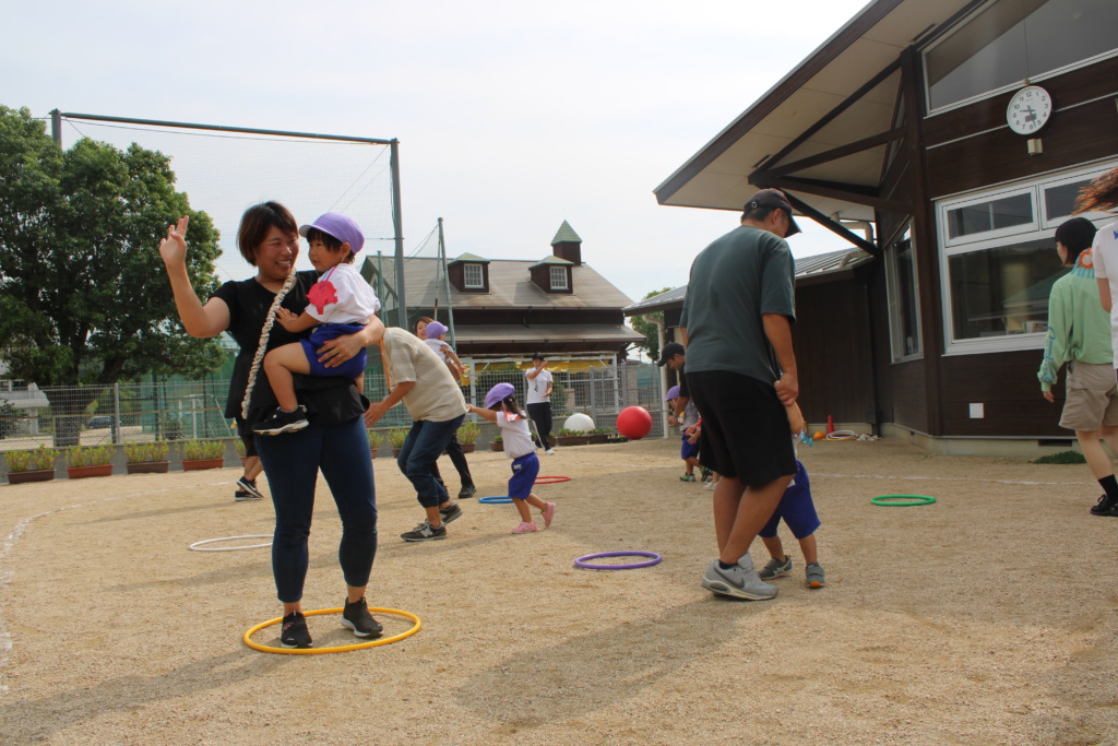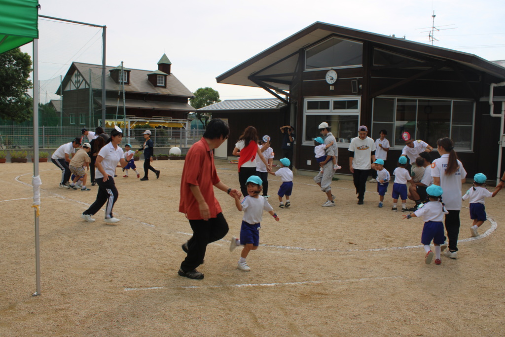 続いて、3歳児、2歳児はそれぞれ親子で今大好きな集団遊びをしました。「集団遊び」にはルールがあり、それを理解し、守れるようになったこと、走ったり、止まったりの動きの成長などを感じてもらえたのではないかと思います。参加された保護者の皆さんもしっかり走ってくれて、笑顔があふれていましたよ。