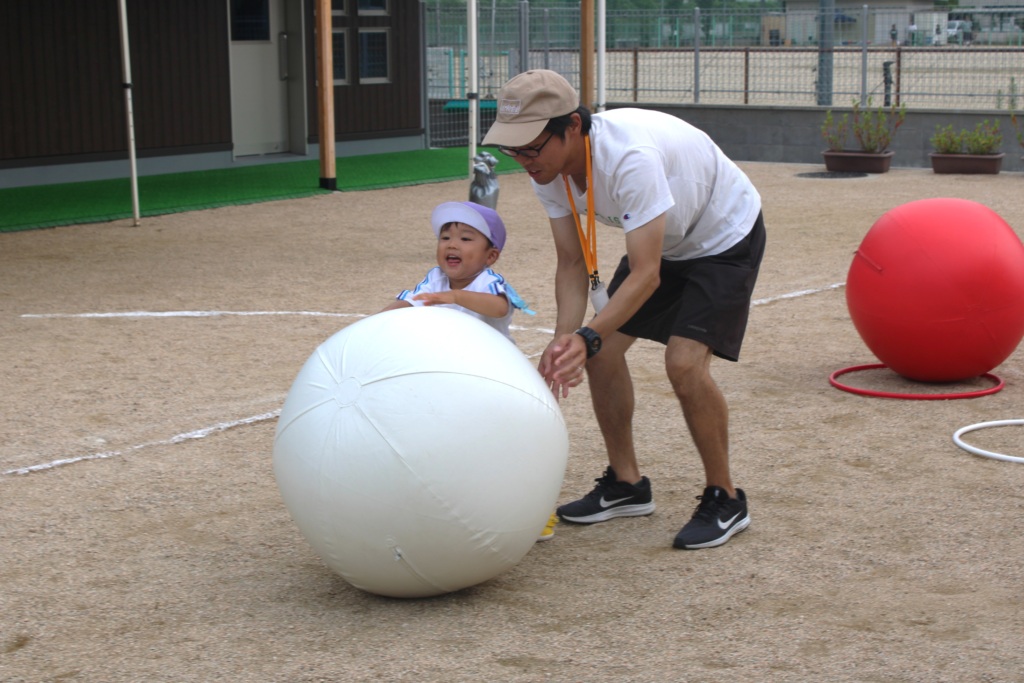 1歳児親子と2歳児は、先生が引っ張るかごに向けて球を投げ入れる追いかけ玉入れをしました。球を拾って、かごをめがけて投げることを楽しみました。1歳児親子は最後に「ばんざ~い」で玉を上へ投げました。高く投げることもできるようになって、なんだか打ち上げ花火のようでした。最後はきちんと球のお片付けもしましたよ。