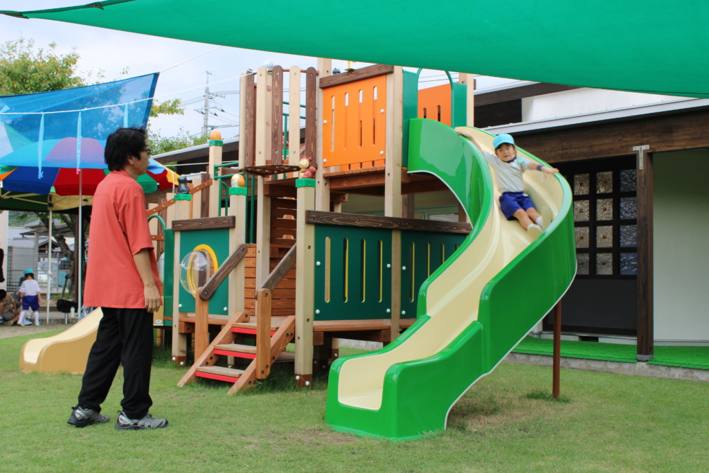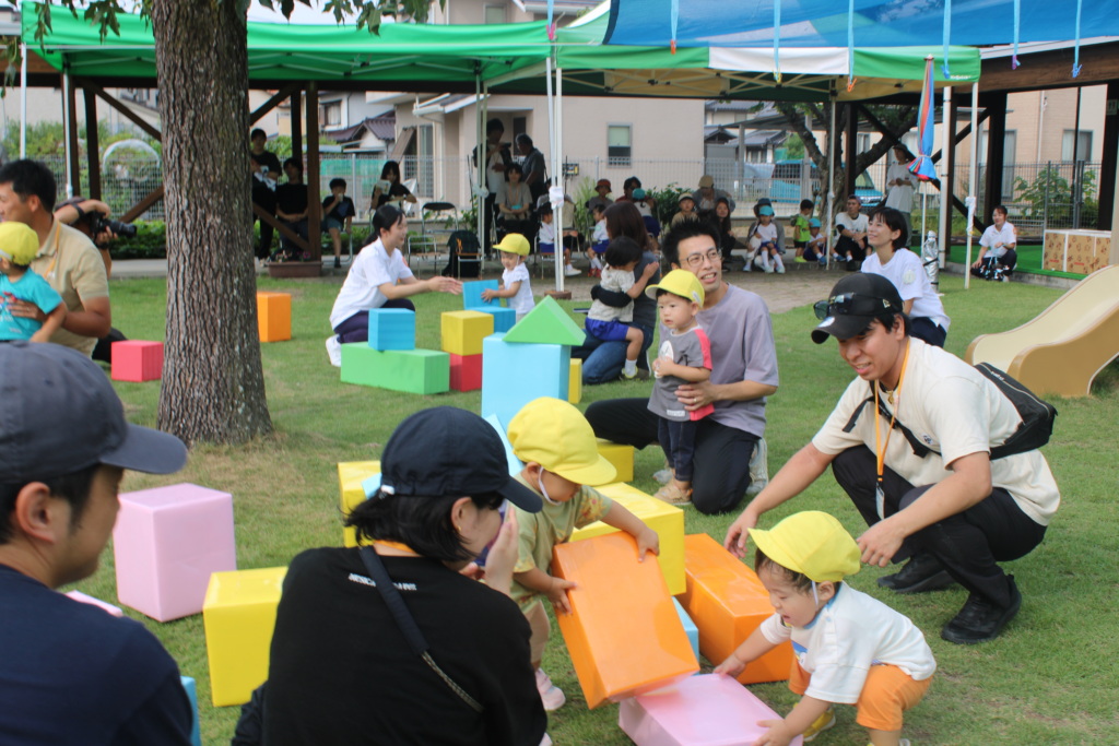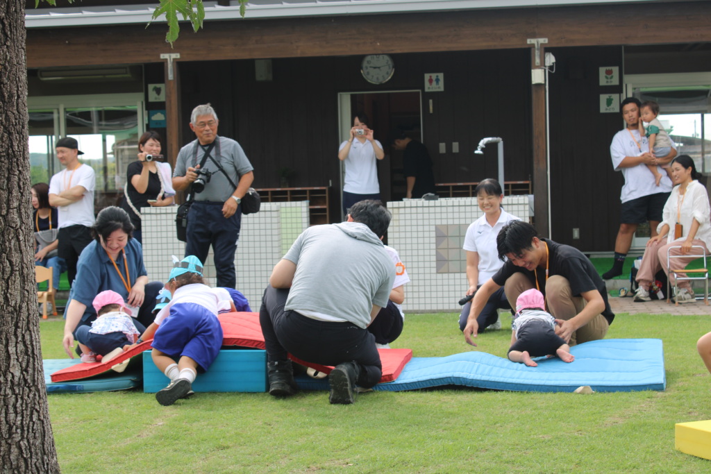 続いて0歳児は、芝生園庭で好きなあそびを見つけて自由に遊びました。それぞれのあそびコーナーには3歳児のお兄ちゃん・お姉ちゃんが優しくサポートしてくれてとても温かな時間と空間でしたよ。
