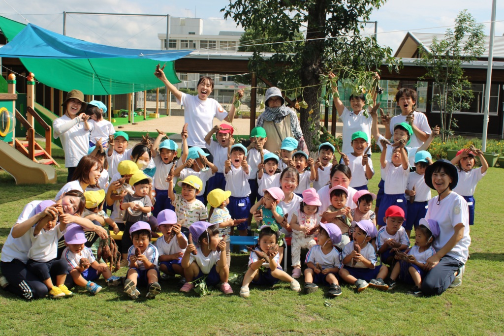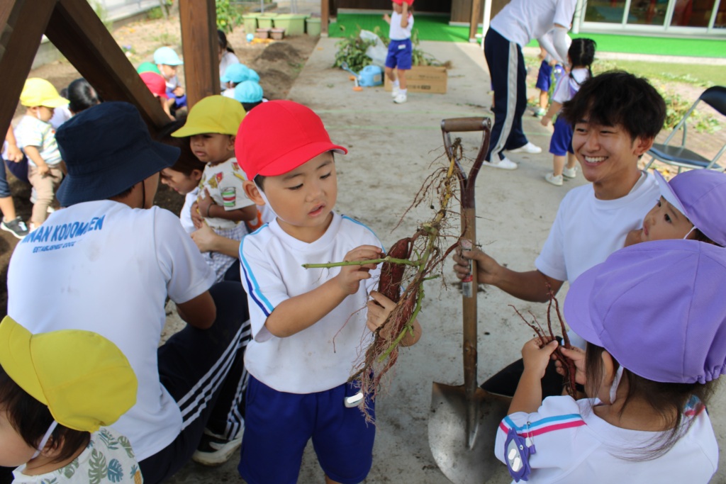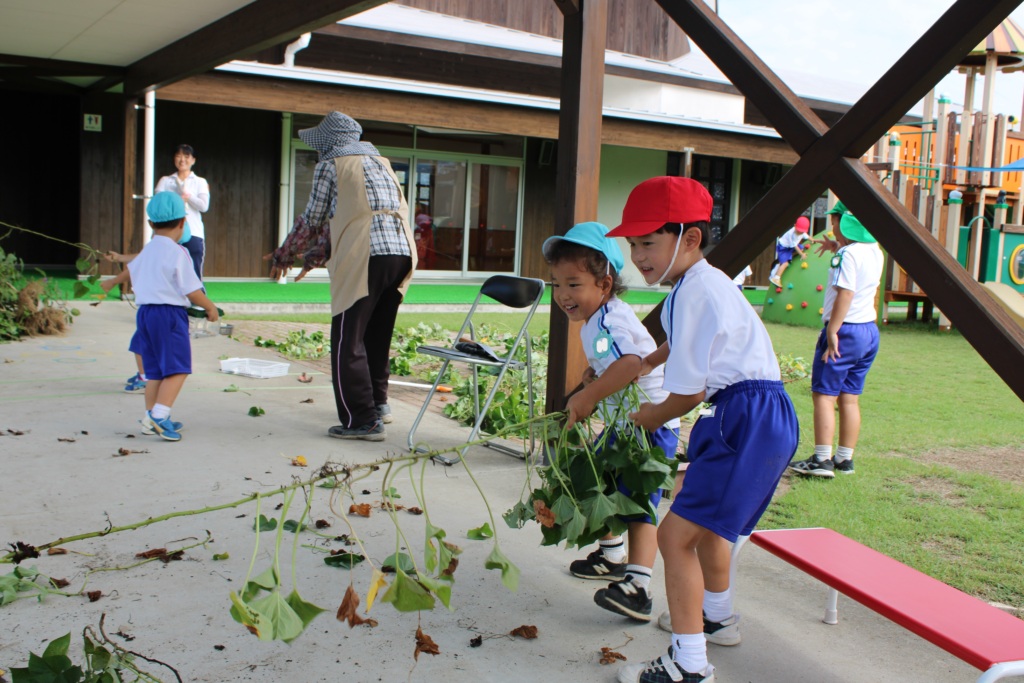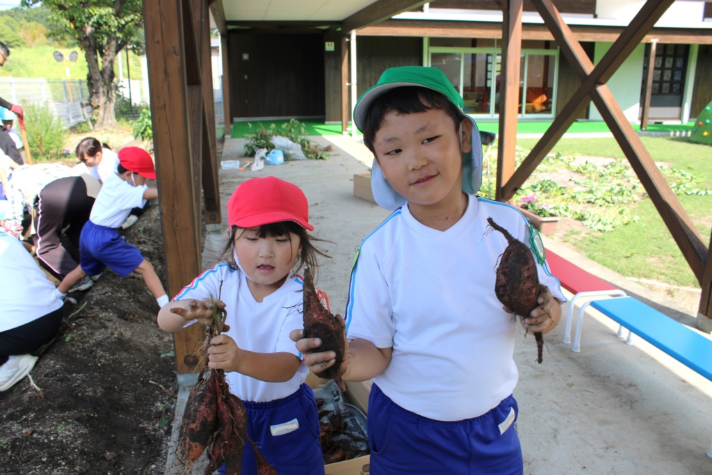 地域の方から「美味しいおやつにしてもらってね」と言ってもらうと、「焼き芋食べたい」「天ぷらにしたい」と子ども達のおイモパーティーの夢がどんどん広がっていました。畑で育った秋の味覚を皆で味わいたいと思います。