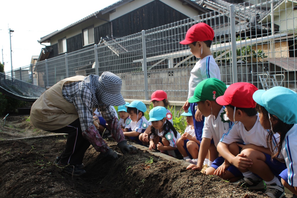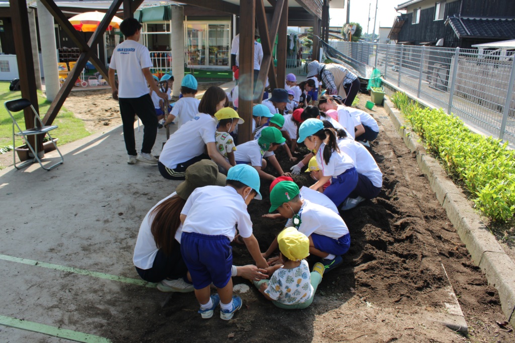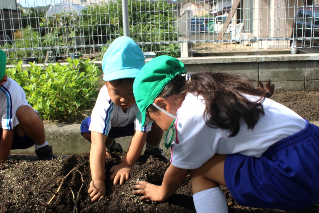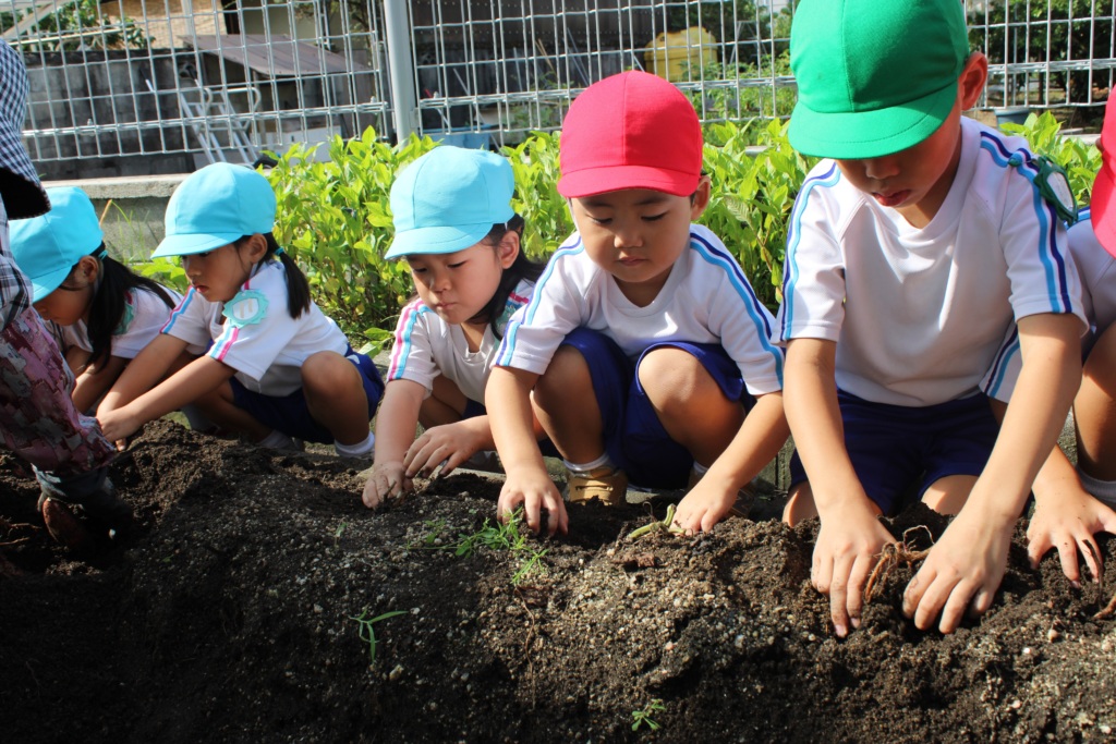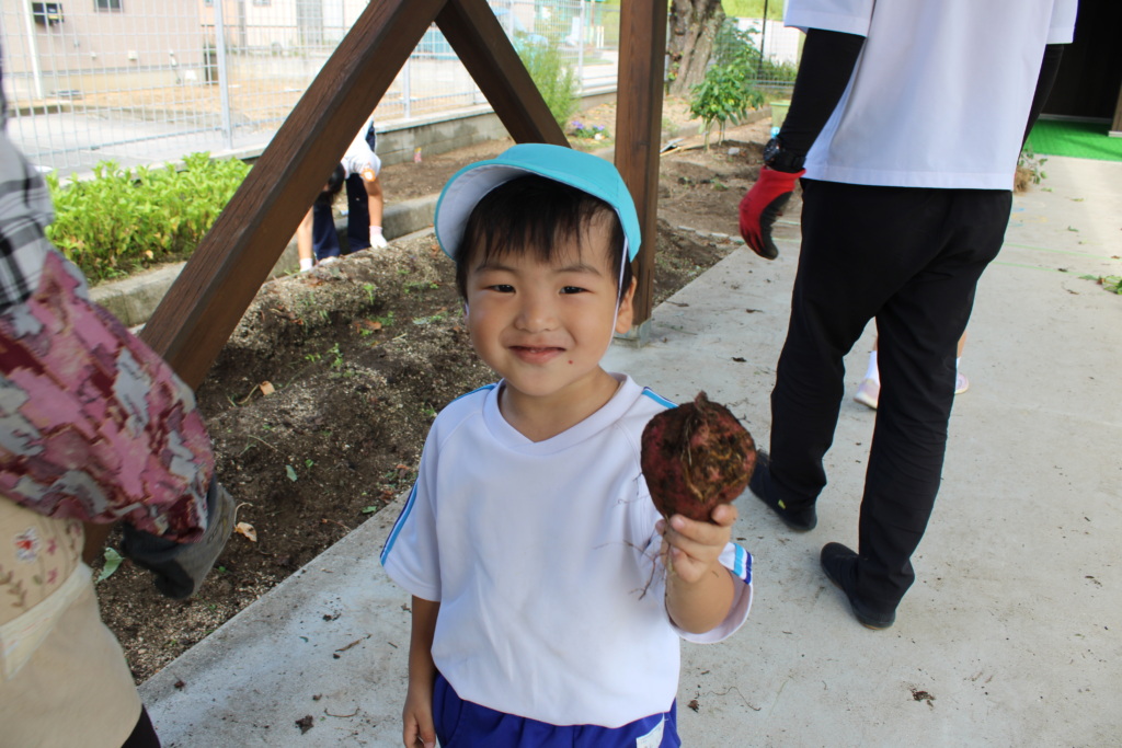 地域の方から「美味しいおやつにしてもらってね」と言ってもらうと、「焼き芋食べたい」「天ぷらにしたい」と子ども達のおイモパーティーの夢がどんどん広がっていました。畑で育った秋の味覚を皆で味わいたいと思います。