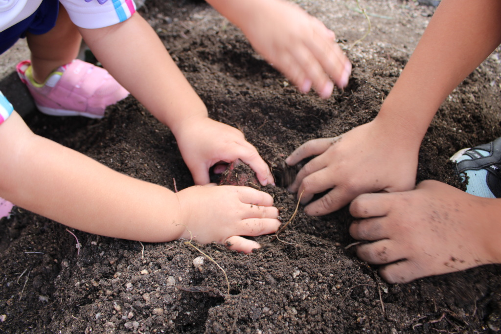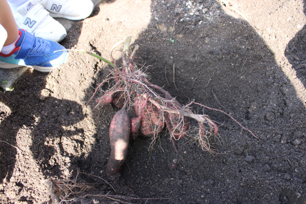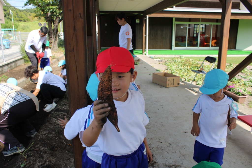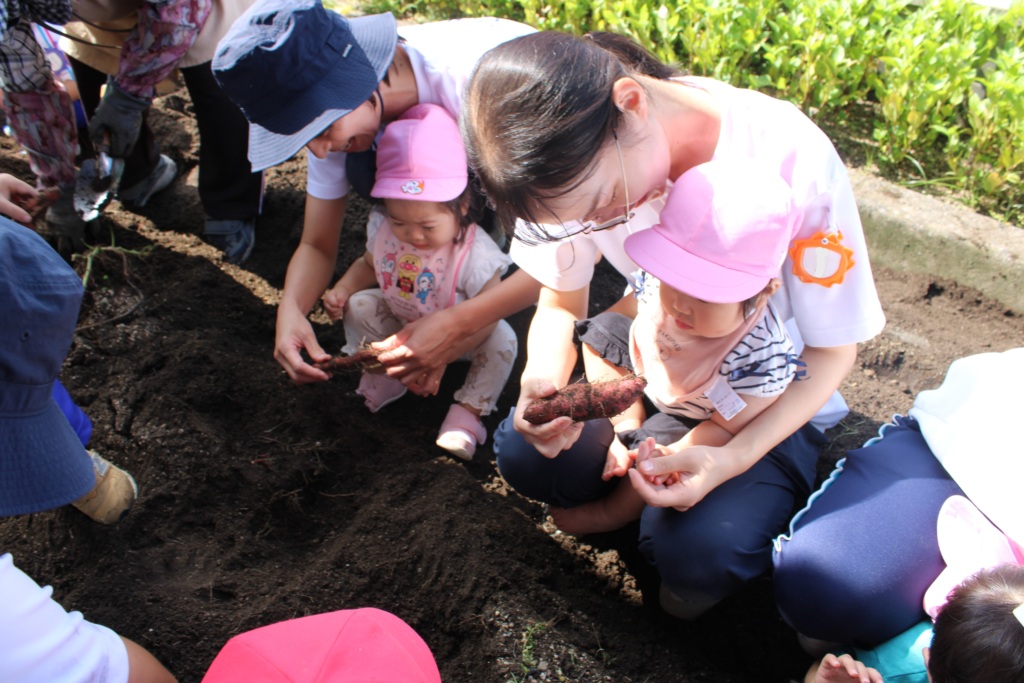 それでは、イモ掘りスタート!最初は大きな3・4・5歳児クラスから始めました。手で土を掘り進めるとすぐに「あった!」という声がたくさん聞こえて来ました。大きく育ったおイモが、焦って抜いて途中で折れないようにできるかな?しっかり奥まで掘って、うまく抜けました!「掘れたよ!」と喜びながら、「顔より長いよ」などとおイモの長さを比べたりもしていました。
