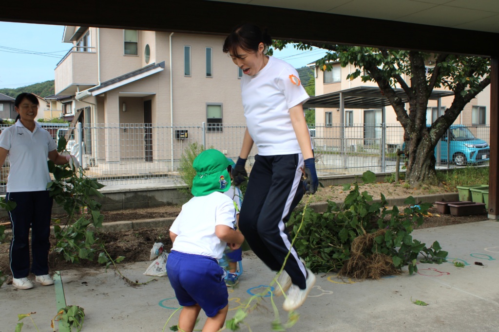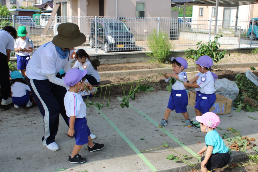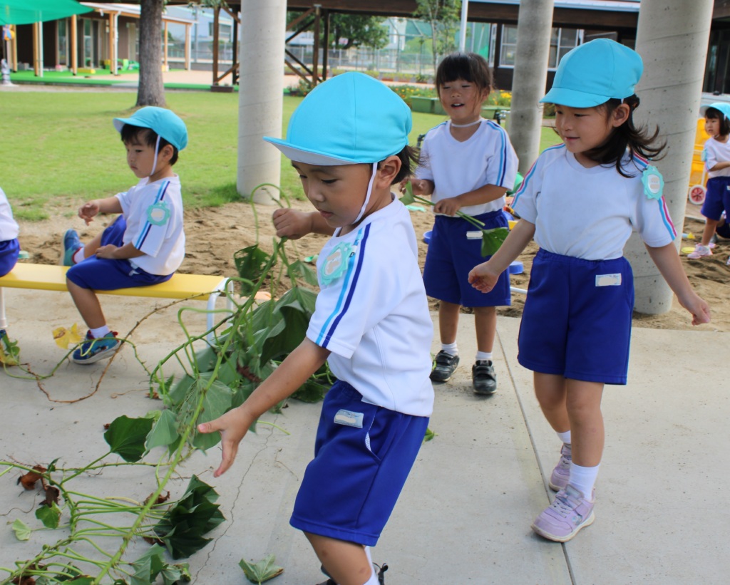 5月22日に地域の方と一緒にサツマイモのツル植えを行ってから約4ヶ月。そろそろイモが大きくなっているかな?ということで、皆でイモ掘りをすることにしましたが、その前に!まずは、たくさん生い茂った葉っぱやツルを3・4・5歳児で抜いてみました(ツル上げ)。ツルを引っ張ってみると他のツルに絡まっていたり、それをほどくと凄く長く伸びることを発見したり、そしてそのまま綱引きのように引っ張ったりしました。「すごく長いね!」と驚いたり、「うんとこしょ~!」と友達と力を合わせて引っ張ることを楽しんだり、とれたツルで縄跳びをしてみたり、葉っぱを匂ったり、傘に見立てたりとツル上げだけでも大盛り上がりでした。