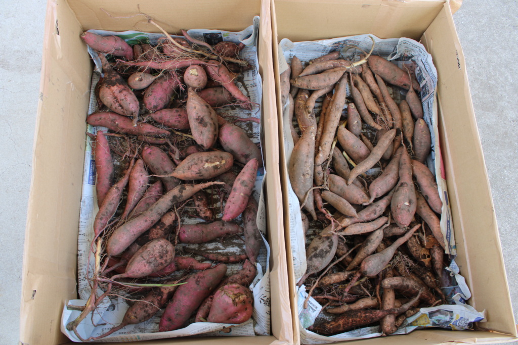 栽培していたサツマイモは2種類。安納芋は細長いのがたくさん出てきて、鳴門金時は大きいのや小さいの、細長いのと色々な形のおイモが出てきました。みんなで数を数えてみると、安納芋は約70本、鳴門金時は約40本も収穫することができましたよ。