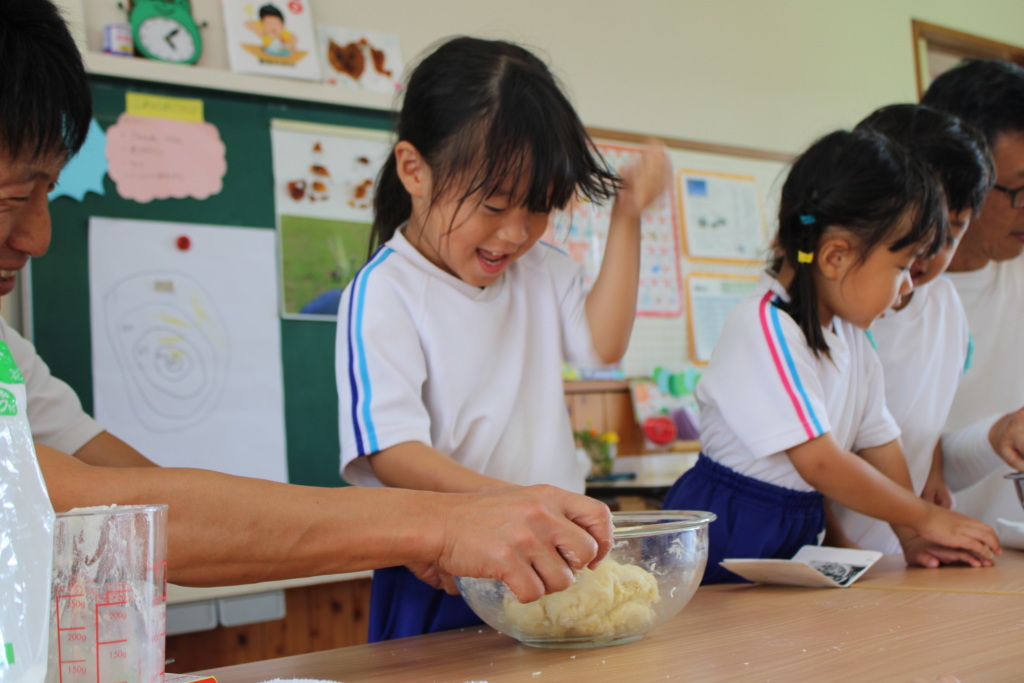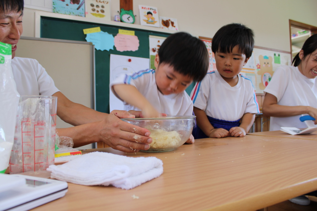 次は、生地作り。これももはや恒例になってきました。パン作りに使うドライイーストをオリーブオイルとともに小麦に加え、生地をこねます。イースト菌にしっかり働いてもらえるように「起きてー!」と生地をパンチ!繰り返していくうちに子ども達の生地作りの腕が上達していくのが分かります。