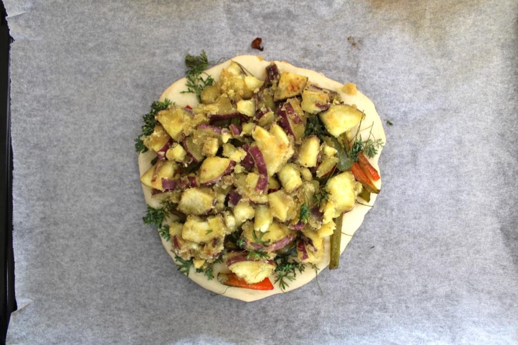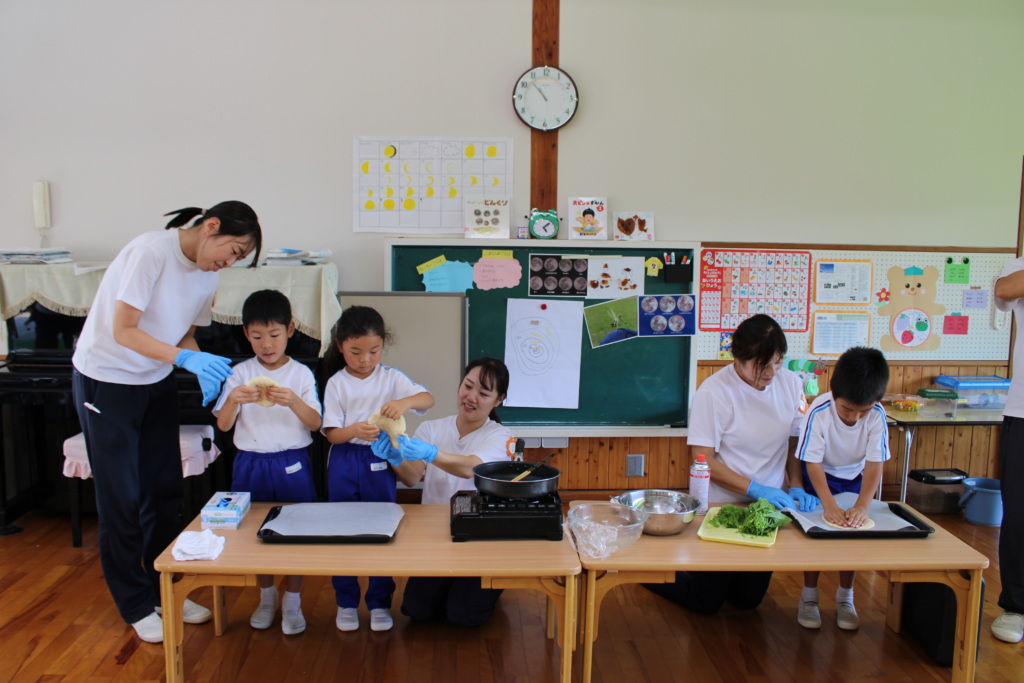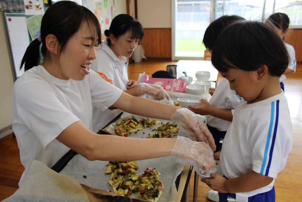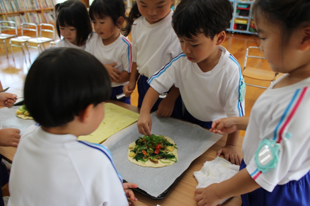 さあ、ここから子ども達の出番!4枚の生地に具材を自由にトッピングしていきます。グループに分かれて行うと、それぞれのグループごとの個性が出て、具材の分量やデザインの違いが生まれとても面白かったです。
