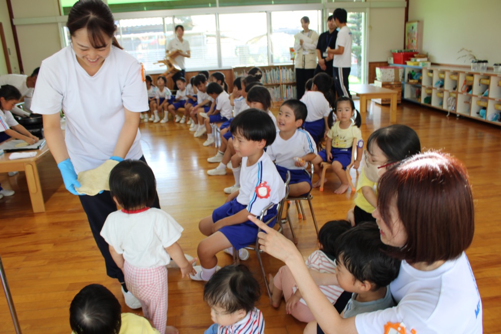職員が切り分け、子ども達は好きなピザを取りに来ました。自分たちで作ったピザに見た目も味も大満足!「おかわりある?」の声がたくさん聞こえてきましたが、「小さなクラスのお友達も食べるから今日はないよ」というと納得してくれました。次回はもっとたくさん生地が必要になりそうですね。