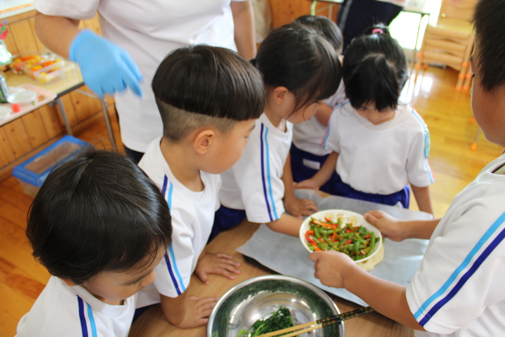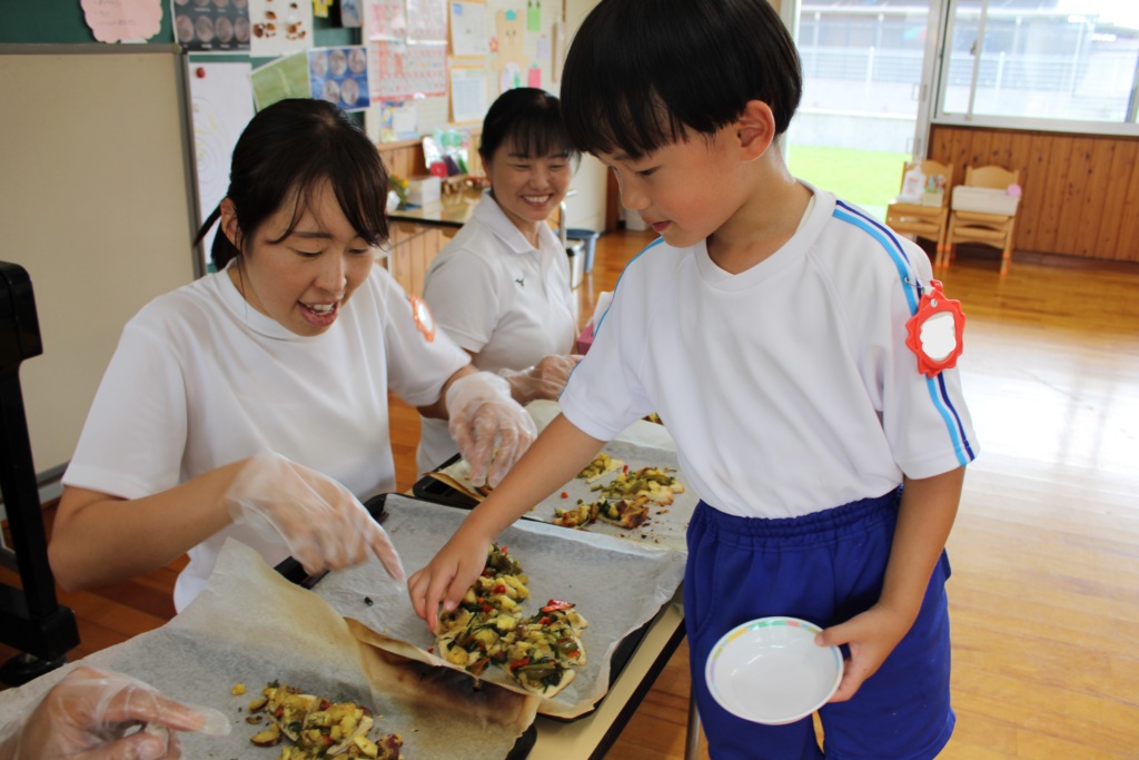 採れたての瑞々しい野菜を使い、自分たちで調理して食べると、旬の味を感じたり、元気パワーをもらったりできますね。こうして食べた物が子ども達の健康な体をつくってくれています。なんだか命のつながりを感じますね。今度はどんな物を作って食べようかな?ピザづくりも季節ごとに継続していきたいと思います。