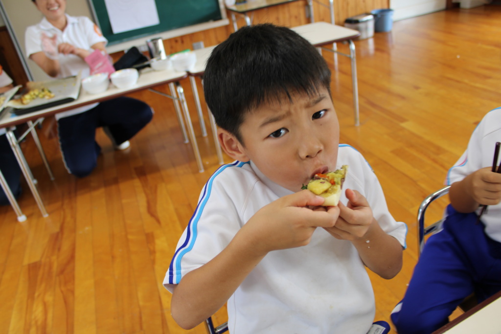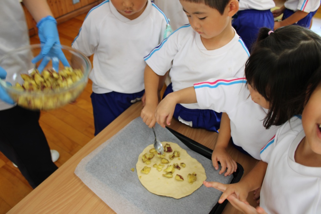 完成したら今度は具材の準備。サツマイモは予めレンジで加熱したものを、パプリカや葉物は子ども達の前で切ったものをフライパンで炒めました。それだけで部屋中にいい匂いが…お腹がすいてきます。
