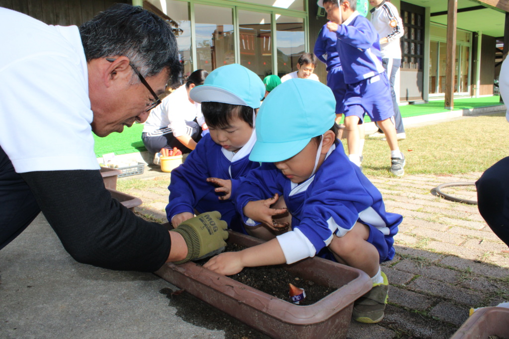 先日、春の訪れがたのしみになるよう、子ども達がチューリップの球根植えやイチゴ・タマネギの苗植えを行いました。