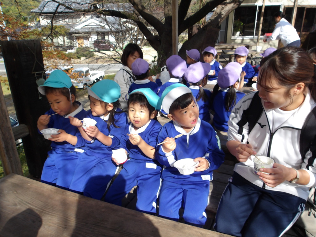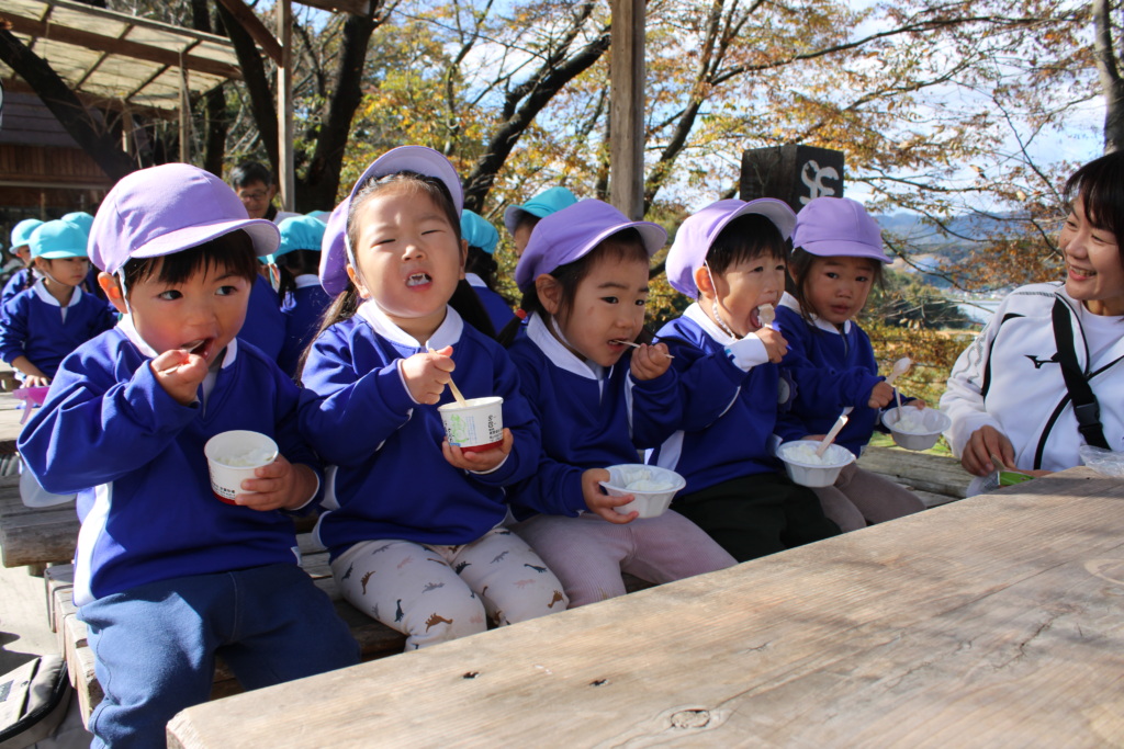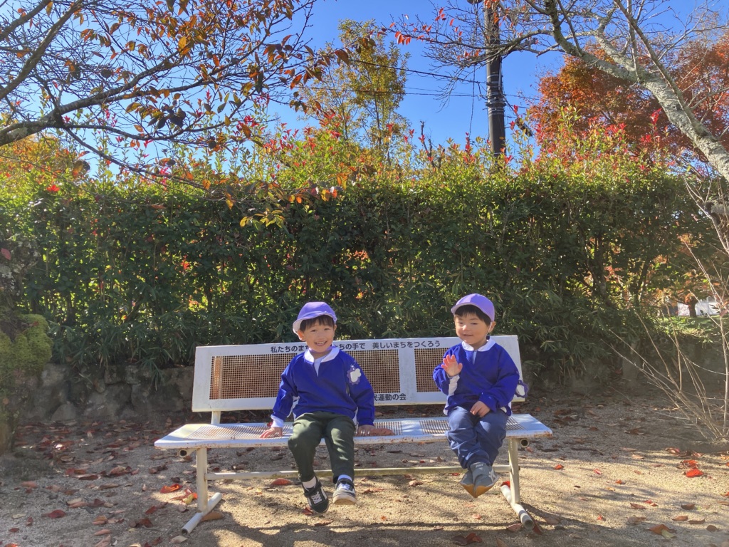 足守地区へ2・3歳児クラスがバスに乗っていきました。2歳児クラスの子ども達にとっては初めての遠足ということもあり、バスに乗り込む時から「しろいバスだ」「おおきいね」と言ってウキウキなようす。大きな窓から見える紅葉した山や川を見て「黄色の葉っぱが見えるよ!」など興奮した声が聞こえて来ました。