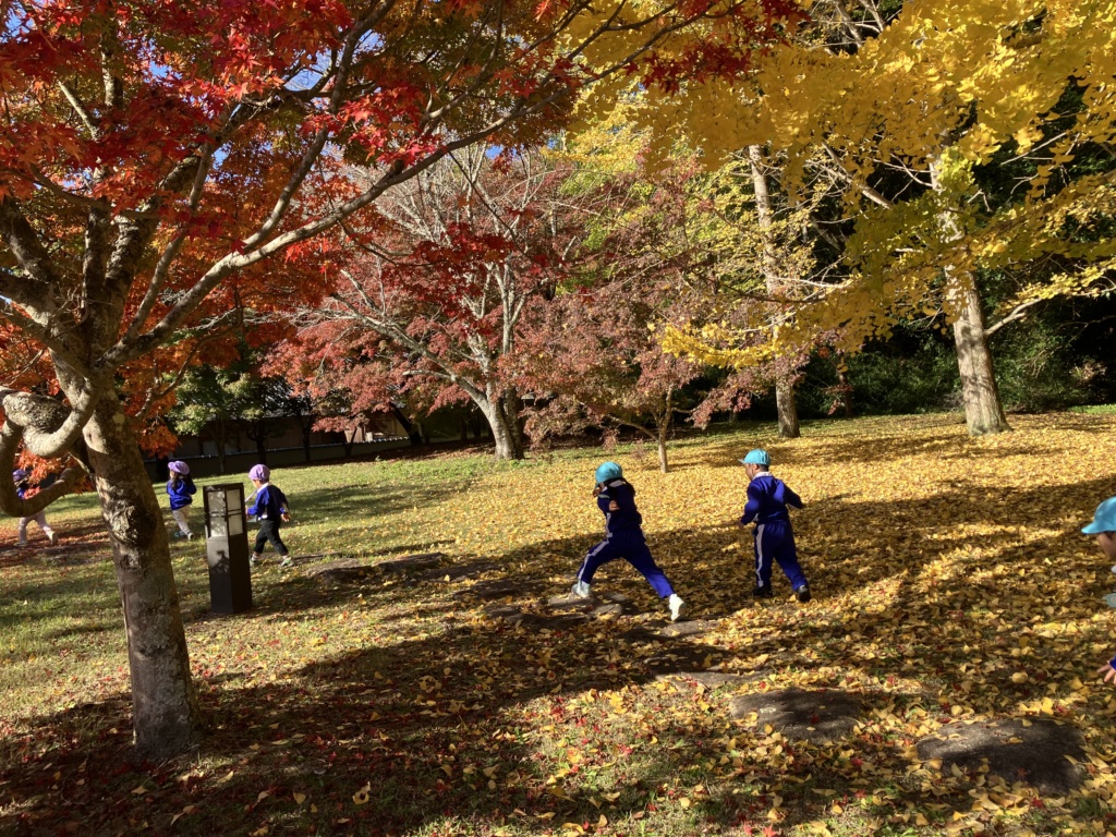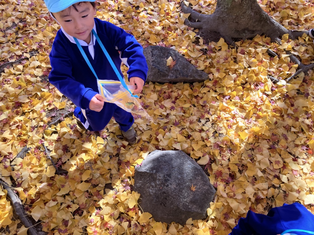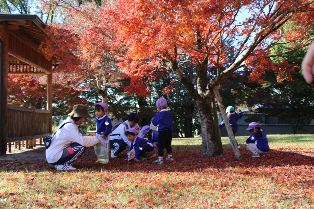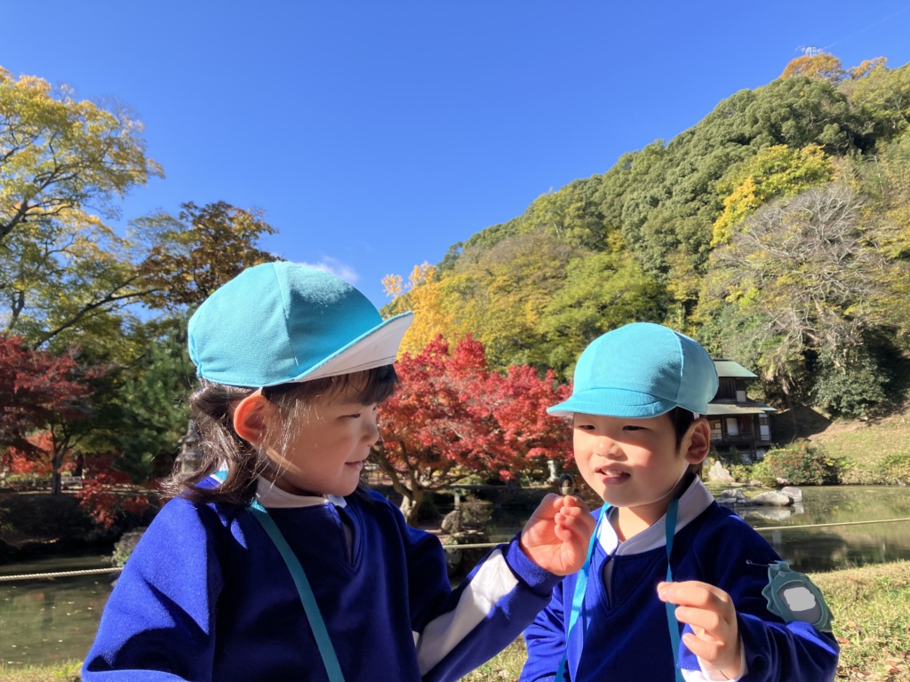 近水園は紅葉が見ごろを迎え、「わぁ!きれいだね!」と子ども達からも声があがっていました。木の下まで歩いて行ってみると、鮮やかに色づいたイチョウやモミジの葉っぱがたくさん!また別の場所にはドングリも落ちていて、「このかたちのドングリがいい!」「ぼうしもみつけた!」と夢中になって2歳児も3歳児も手作りバックに入れていましたよ。3歳児はもう少し足を延ばして違う種類のドングリも集めたりしました。風情のある庭園で紅葉と共にその美しさに触れることができたようでした。