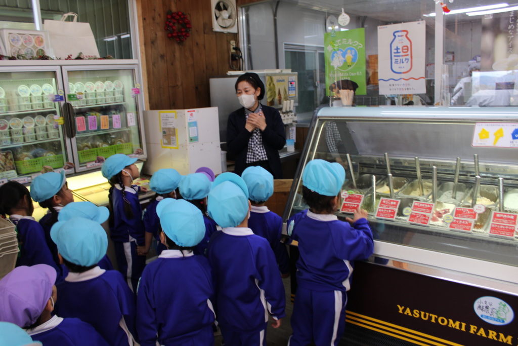再びバスに乗り安富牧場へ向かいました。まずは子ども達がとても楽しみにしていたソフトクリームを味わいました。牛乳の味を一番味わうことができるのはソフトクリームだと教えていただき実際に食べると…「つめたくておいしい!」「ミルクのあじがする」とミルクそのものの深い甘みを感じているようでした。お店の方にどうしたらおいしいソフトクリームができるのか質問すると、「牛さんを大切に育てることで、元気な牛さんが美味しいミルクを出してくれるよ。」と教えていただきました。質問にお答えいただきありがとうございました。