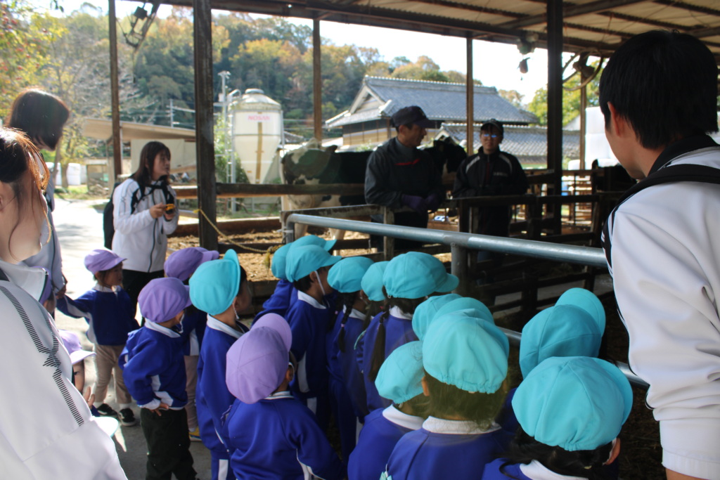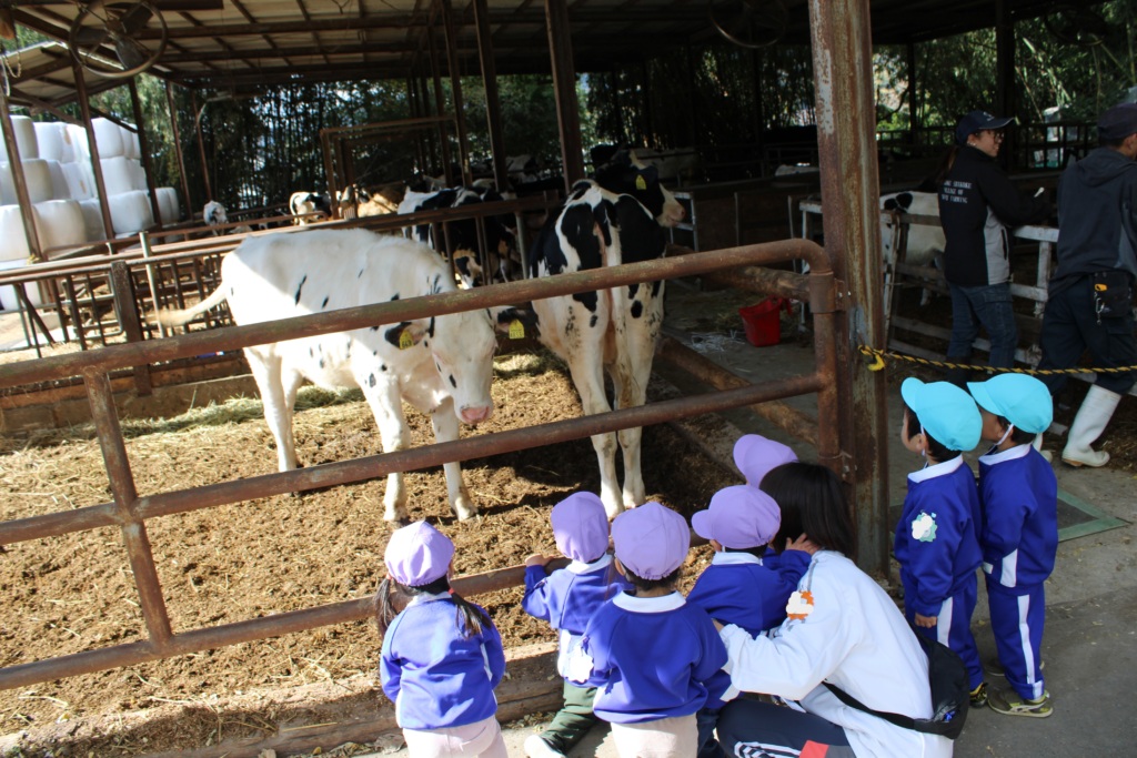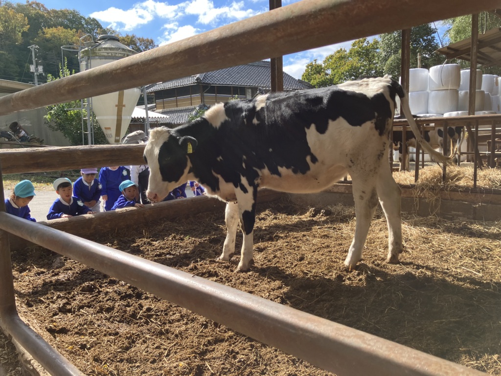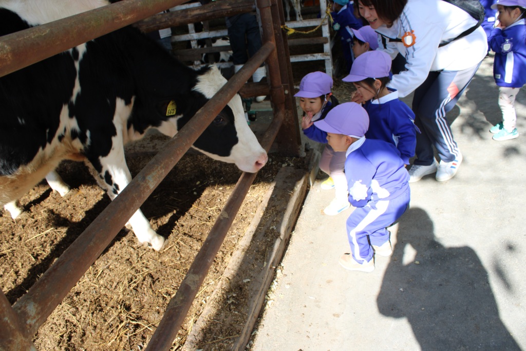 美味しいミルクを出してくれる牛さんに会いに行こう!と牛舎まで行くと、元気いっぱいの牛たちに子ども達もびっくり!それぞれの子ども達がとても興味をもち、じっくりと観察することができていました。また子ども達なりに様々な発見をして、「目がかわいいね」「しっぽがながい!」と気付いたことをたくさん教えてくれました。実際に牛を育てている方から、「小さいときから大切に元気に育てることで、立派な大人の牛になっていくよ。皆もお外でいっぱい遊んで元気になるんだよ。」と教えていただきました。丁寧にご対応いただきありがとうございました。
