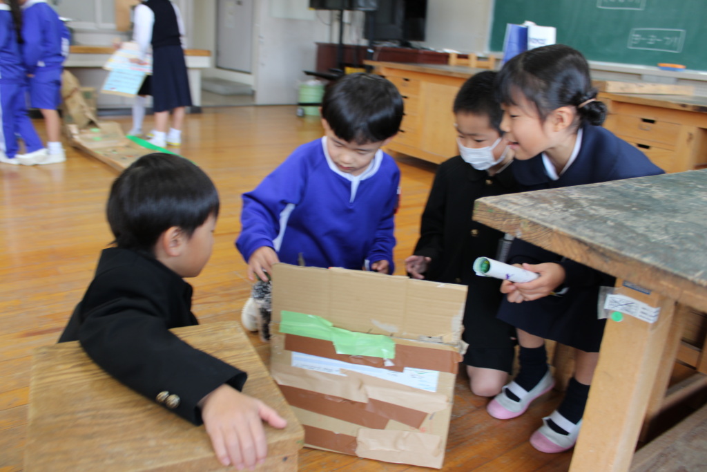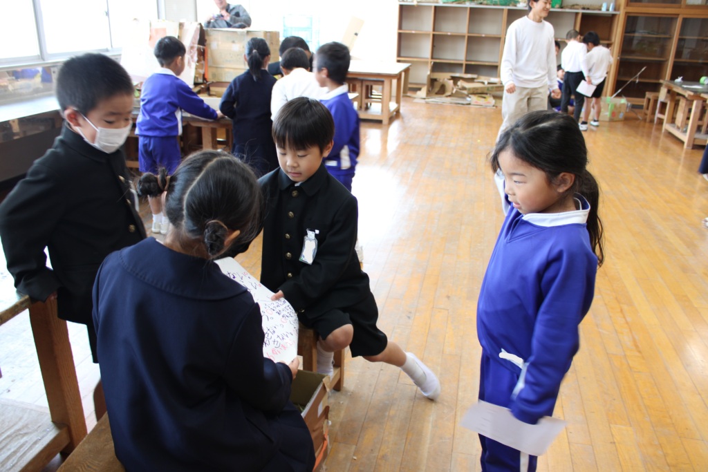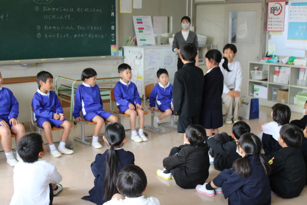 12月1日(月)、4・5歳児が馬屋下小学校の一年生に招待してもらい、秋祭りに参加させていただきました。小学校に着いて、まずは校長先生にご挨拶。「おはようございます!」と挨拶すると、「みなさん、待ってましたよ~!」と優しい笑顔で迎えてくださいました。そして、1年生の教室へ入ると、1年生のお兄さん、お姉さん達が迎えてくれました。1年生からの歓迎の言葉や先生からの説明を聞き、お祭り会場のコーナー遊びのスタンプカードをもらいました。