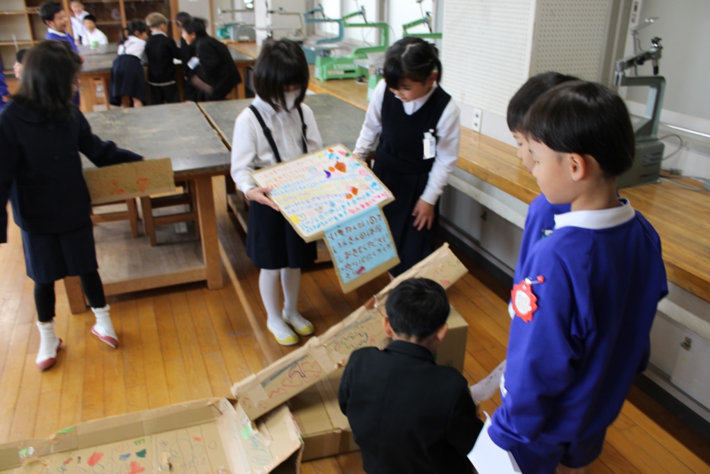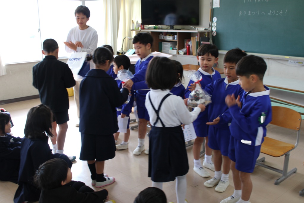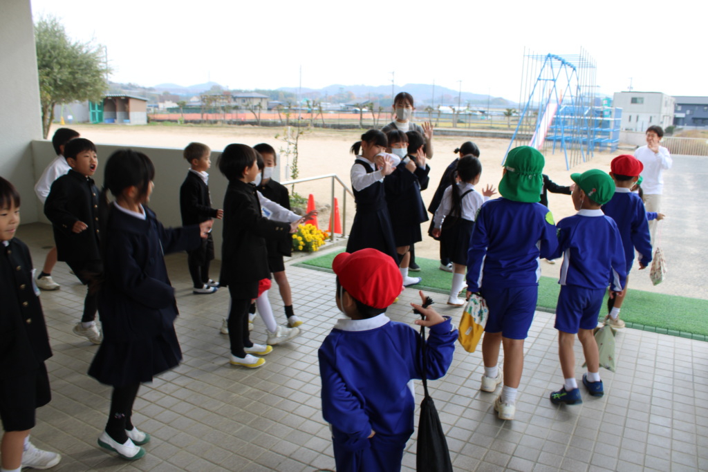 秋祭りが終わり、お礼を伝えあいました。最後に、楽しい秋まつりをしてくれた1年生へ子どもたちが作ったクリスマスツリーをプレゼントしました。「すごーい!」と1年生が感動し、喜んでくれたので、子ども達もとっても嬉しそうでした。「また3学期に遊びましょう」と約束をしてお別れしました。靴を履き替えていると…1年生のみんなが玄関までお見送りに来てくれて「また遊ぼうね!」と言ってくれたので、子ども達も「また遊ぼうね~」ととっても嬉しそうに園に帰りました。