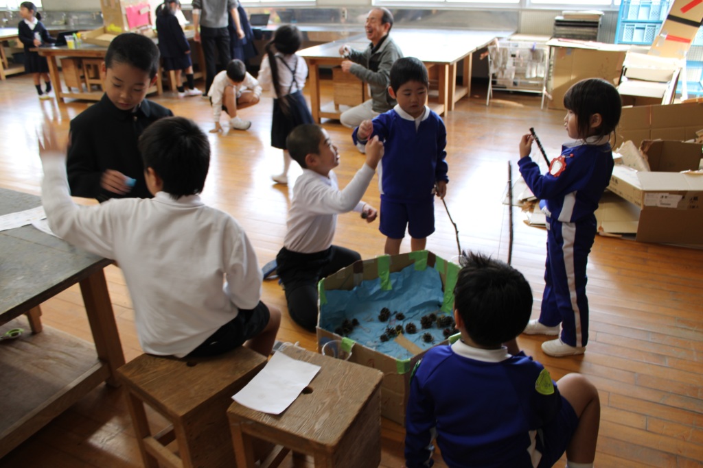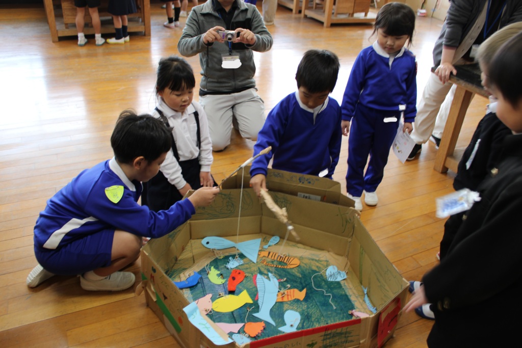 園内でも自然物を使って遊ぶことはしていますが、今までしたことがないような遊び方で、また少し難しい部分もありそれが子どもたちの興味と思考力や挑戦心を刺激して時間いっぱいまで一生懸命に遊び続けました。楽しい遊びを考えてくれたり、優しく教えてくれたりする1年生のお兄さんお姉さんの姿は、子どもたちにとって憧れになったと思います。