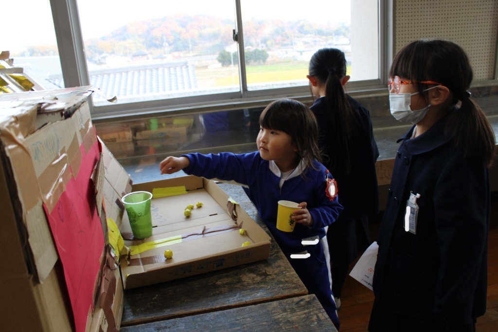 図工室に移動して、いよいよ秋祭りがスタート!的当て、ヨーヨー釣り、ドングリ滑り台、魚釣り、宝探しなど、一年生が秋の自然物を使って素敵な遊びを用意してくれていました。(ドングリの尖ったところをテープで巻いて痛くないようにしてくれるなど、こども園の子ども達のためによく考えて作ってくれていました。)子ども達は各々順に遊びのコーナーを回っていきました。どのコーナーも子ども達が安全に楽しむための約束を一年生が考えて伝えてくれたり、ルール説明をしてくれたりしました。子ども達も真剣に聞いて遊びをスタート!