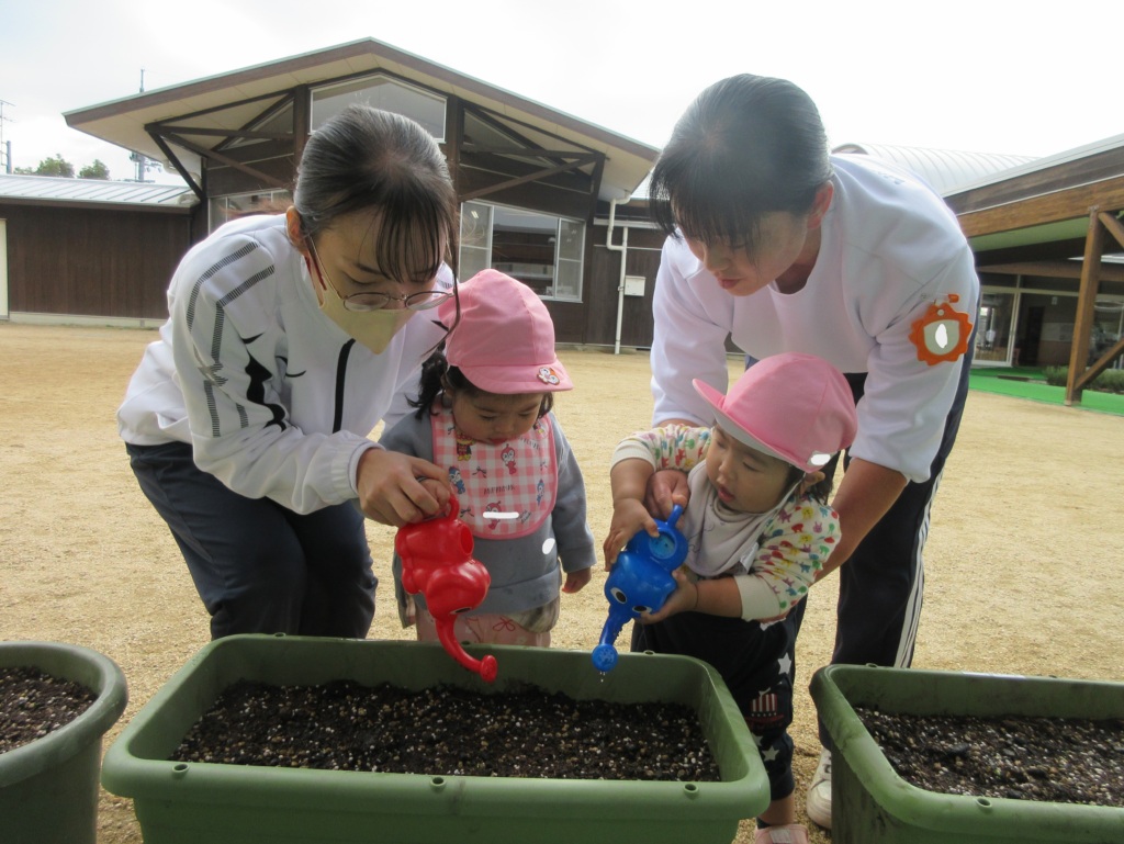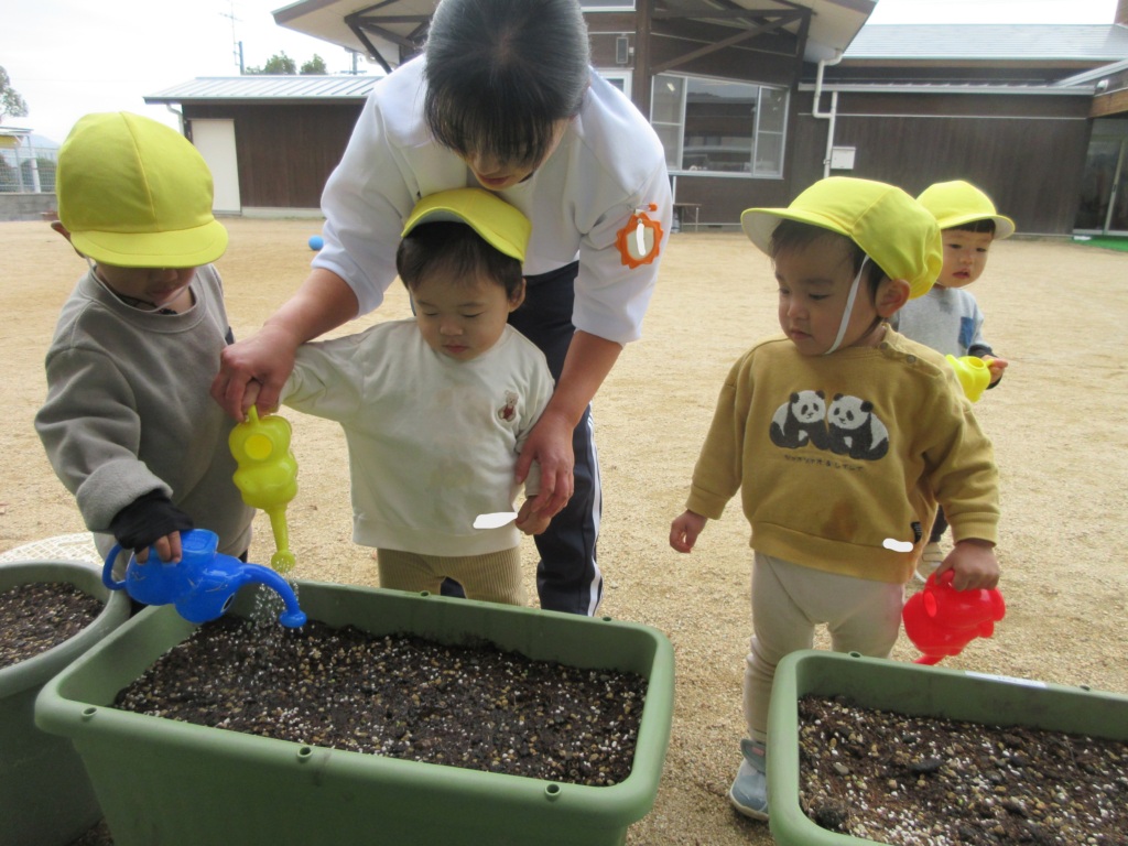 11月中旬、0・1歳児クラスでスナップエンドウの種まきをしました。初めて見るスナップエンドウの種・・・。子ども達は『なんだろう?』というような表情でじっと見たり、そっと触れたりしながら保育者と一緒に種をまきました。
