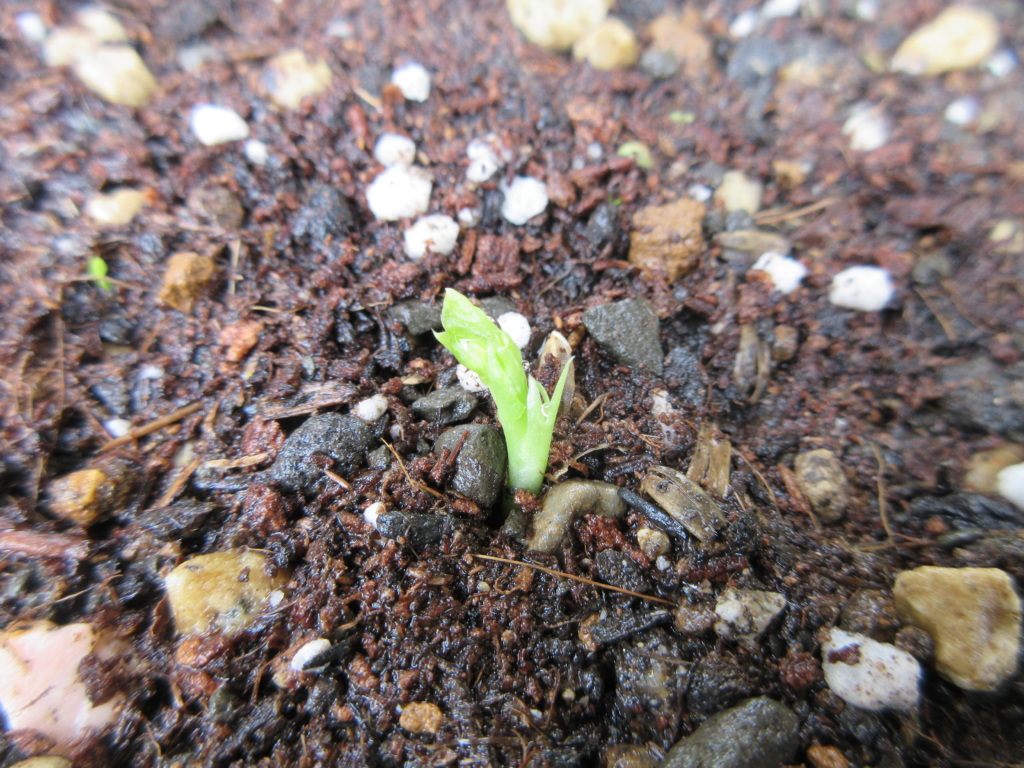 しかし、「今日は芽が出たかな?」と毎日プランターを覗いて見ますが、芽は出ず・・・。発芽目安の4日・・・、そして10日経っても芽は出ず・・・。「どうしたんだろ?」と心配していると、12月に入り、ようやく小さな芽が顔を出し始めました。