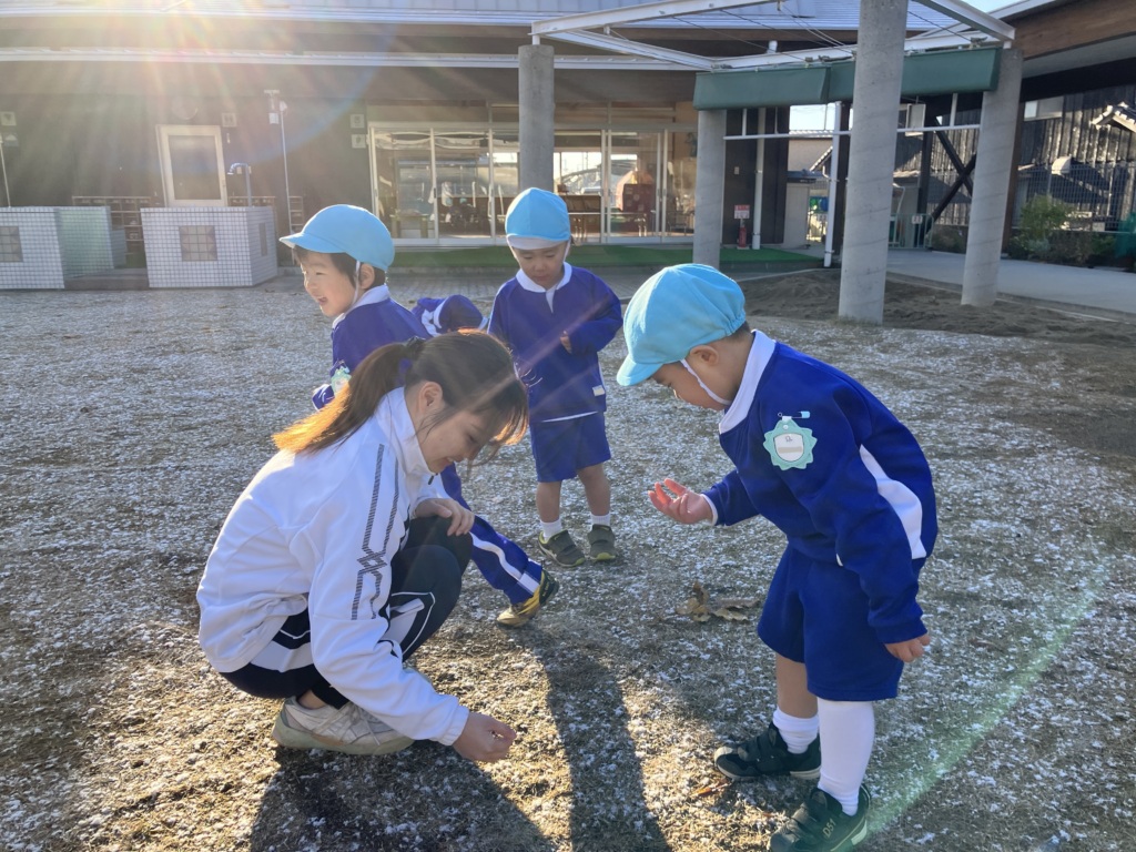 12月4日の朝、馬屋下まんまるこども園では初雪を観測しました。市内中心部では降雪はなかったのではないかと思いますが、馬屋下は山の麓ということもあり、わずかながら積雪が見られました。朝、こども園に来てみると、園庭の芝生や畑、遊具などが夜中から明け方に降った雪でほんのり白くなっていました。