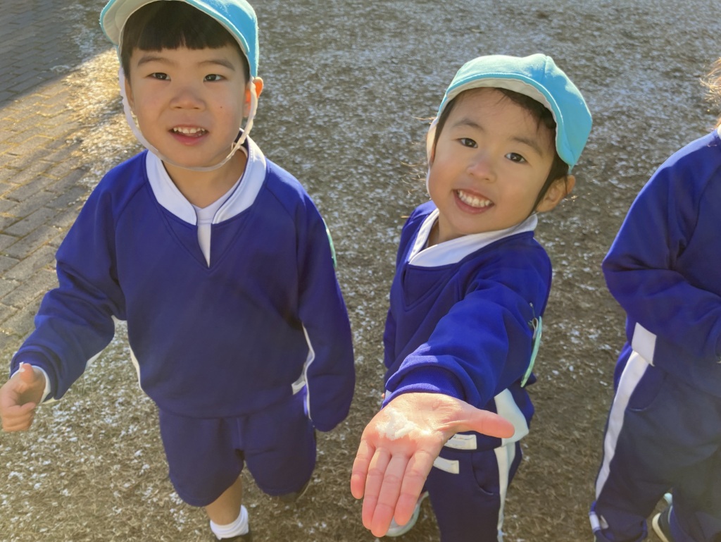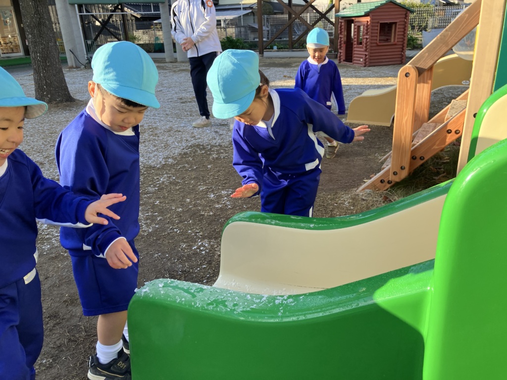 登園してきた子どもたちは、雪化粧を見ると大喜び!「やった~!」と「さむ~い!」が混ざりながら園庭へ飛び出しました。さっそく雪を手に取りじっくり見てみたり、「つめた~い!」と感じたり、集めて雪の塊を作ろうとしたり、遊具に付いた雪に気づいて集めたりと、ワクワクしながら遊んでいました。残念ながら日が上がってくるとあっという間に溶けてしまったので、全園児が雪を感じることができたわけではありませんが、また雪が降る日が楽しみになったようでした。