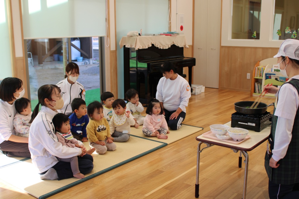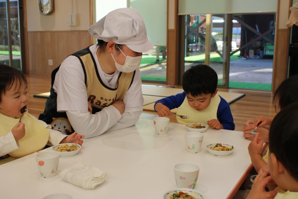 普段の生活の中での栽培活動やあそびが、給食室の先生=大好きな人が目の前で調理してくれたことで、『食体験』につながったようです。こども園で食育を行う意義を再認識した瞬間でした。