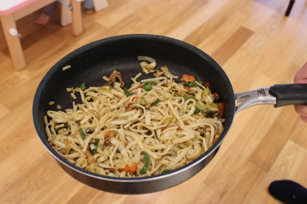 そんなパプリカが大好きなはずの子どもたちですが、実は給食時にメニューに出てくると、どうもお気に召さず、なかなか食べようとしない様子が普段からありました。そこで、これはチャンス!と15時のおやつの時にパプリカを使って、子どもたちの大好きな給食室の先生が目の前で焼うどんを作ることにしました。