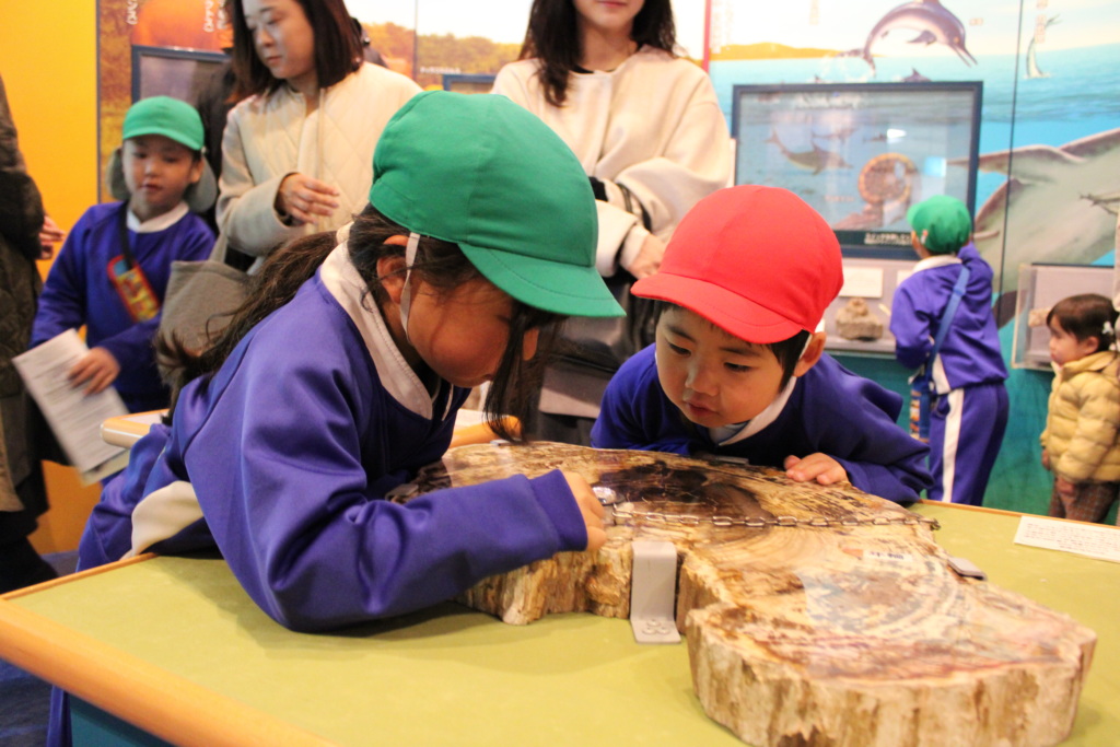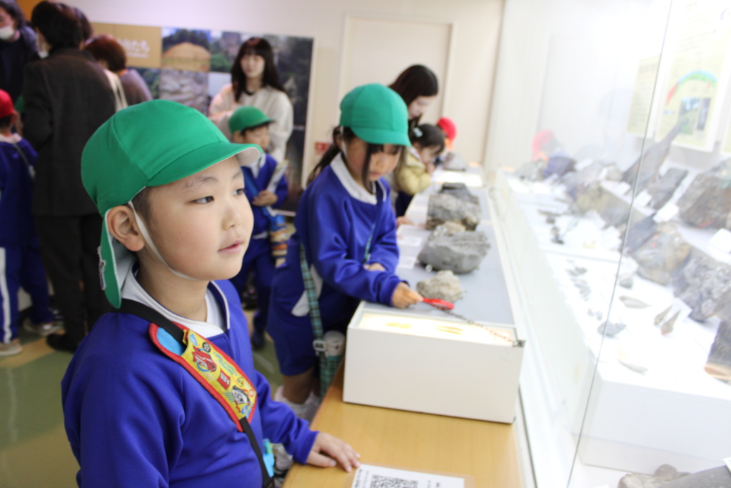 その後、2階上がると地球誕生の歴史とともに本物の化石が展示されており、虫眼鏡を使ってかじりつくように観察していました。また、岡山県の地層や岩石、世界の岩石の展示では、「好きな石を探して、お家の人に紹介してあげよう!」と呼びかけると、じっくり観察して好きな色や質感、形などを伝える姿が見られました。