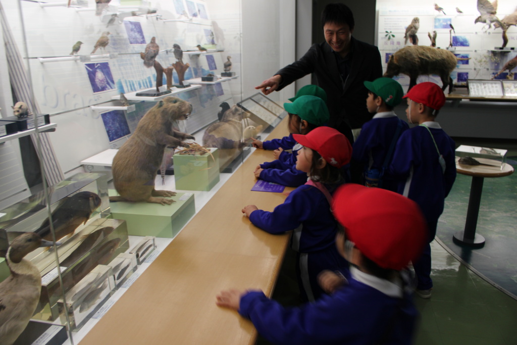 岡山県の生き物の展示では、はく製や昆虫の標本が展示されており、生き物大好きな子ども達が出会ったことがある生き物がたくさん。そこで、「○○(馬屋下プロジェクトで出会った生き物)はどこにいるでしょう?」とクイズを出すと、皆で展示ケースに張り付き、あっという間に見つけ出しました。これには保護者の皆さんもびっくりでした。知っている生き物も実物をゆっくり見ることはなかなかできないのでじっくり観察する良い機会になりました。