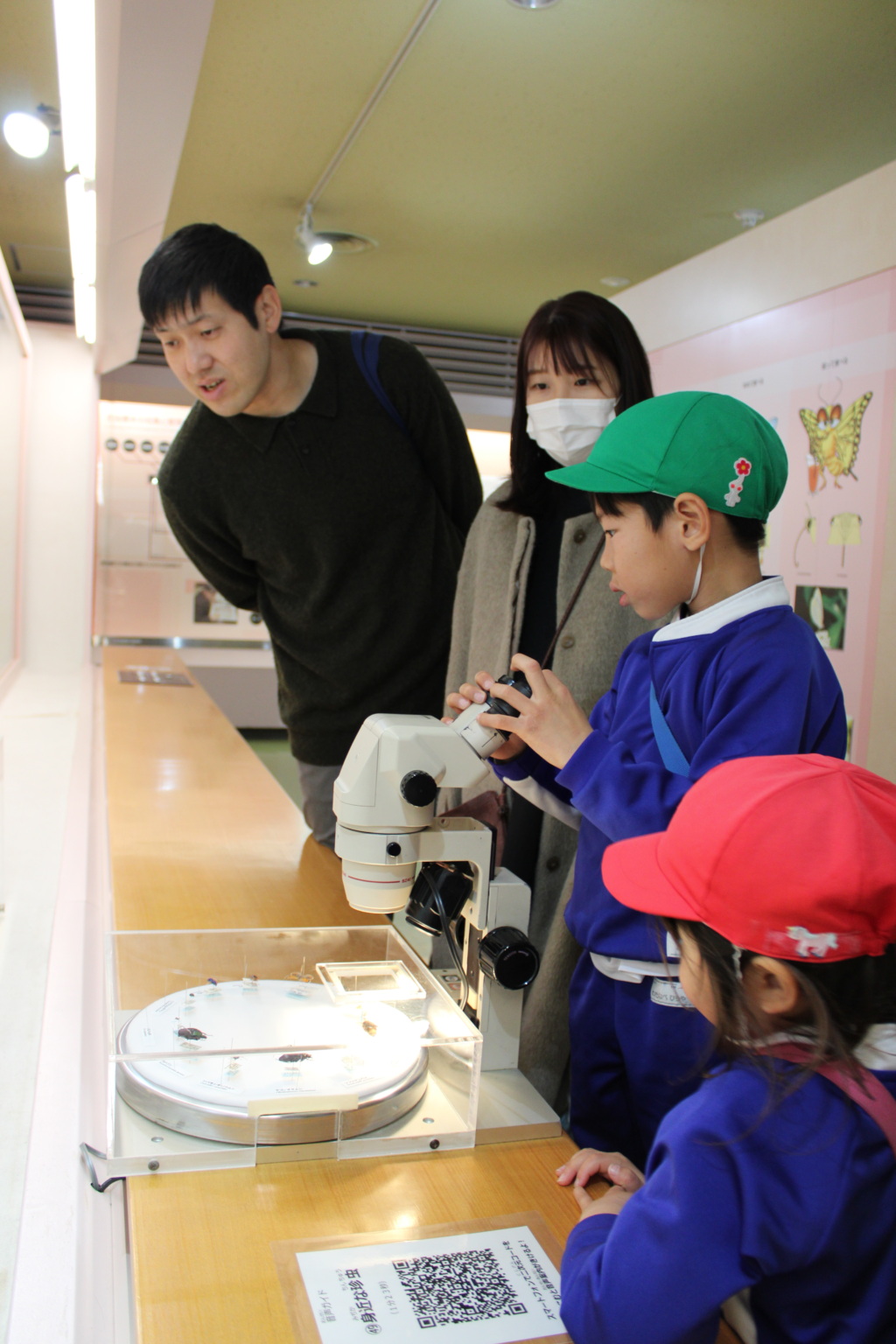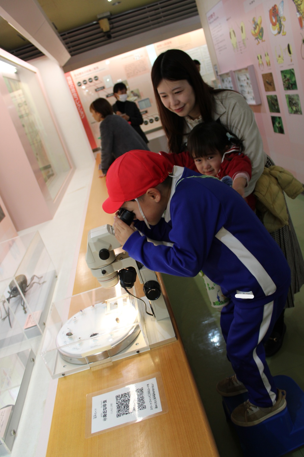 昆虫の標本のコーナーでは、子ども達から「これ、チンチロリン合唱団で出てきた虫がいっぱいいるよ」「こんなきれいな模様の蝶がいるんだね。見てみたい。」などという声が上がるなど、親子で自由にじっくり見学を楽しみました。