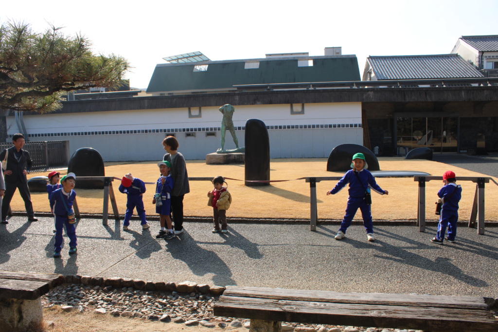 大原美術館に着く手前、別館の外に飾られている銅像「歩く男」という作品に目が留まりました。「あの人、頭と手がないよ。なんか変。」と子ども達は作品を見ながら口にし、保育者の「もしもあの人に頭と手があったらどんなポーズをしているかな?」という言葉を聞き、好きなポーズをとって楽しんでいました。