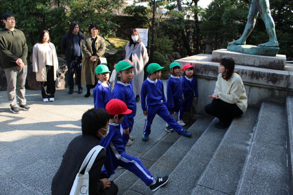 大原美術館本館に着くと、学芸員の先生方が出迎えてくださり、あいさつをしました。「おさんぽプログラム」という幼児向けのプログラムで、学芸員の先生が子ども達と対話しながら作品を見た感想を引き出したり、共有したりして、子ども達は自然に作品を見る楽しさを理解していっているようでした。