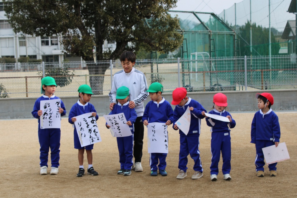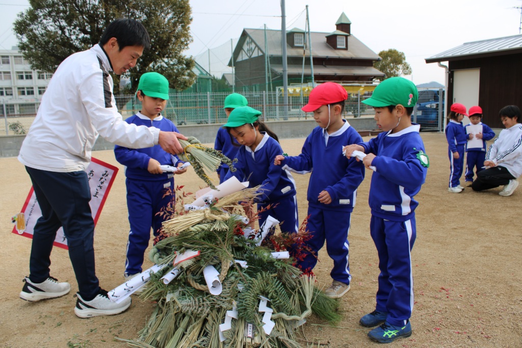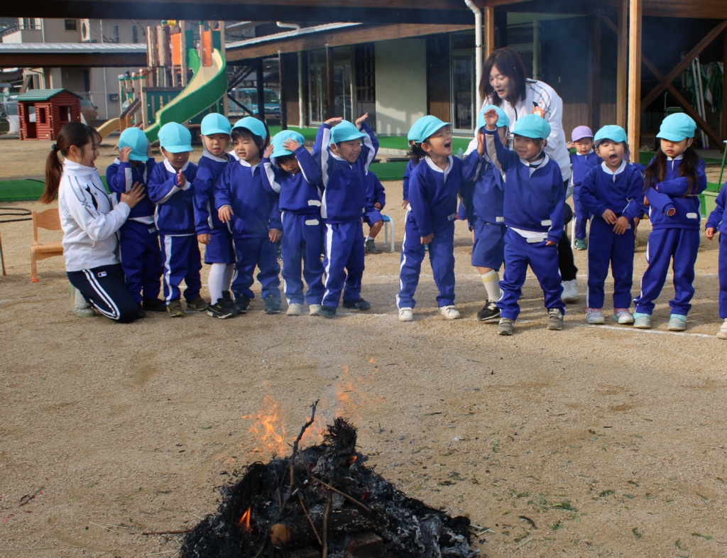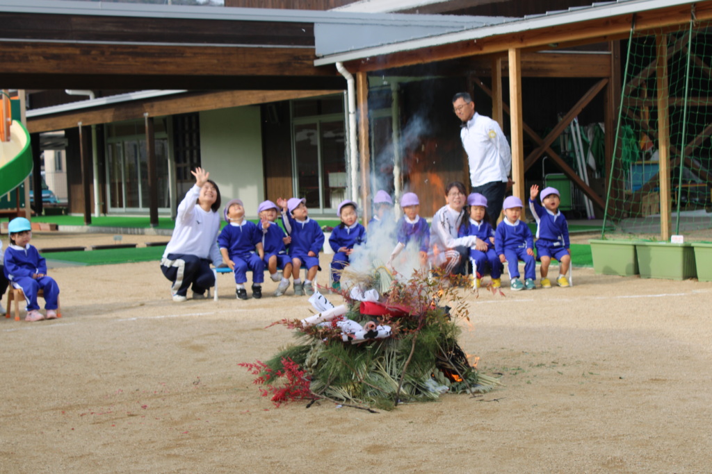 1月15日は「とんど焼き」を行いました。園では年末におもちつきを行ったり、正月飾りや門松を用意したりしてお正月を迎えました。この日はお正月の終わりの行事として、各家庭からお飾りと書初めを持ち寄っていただき、お飾りには豊作を願ったり、子孫繁栄を願ったり…といった意味を簡単に子ども達に伝えました。各クラスで書いていた新年の抱負を紹介し合ったり、4・5歳児は自分で書いた抱負を紹介したりしました。
