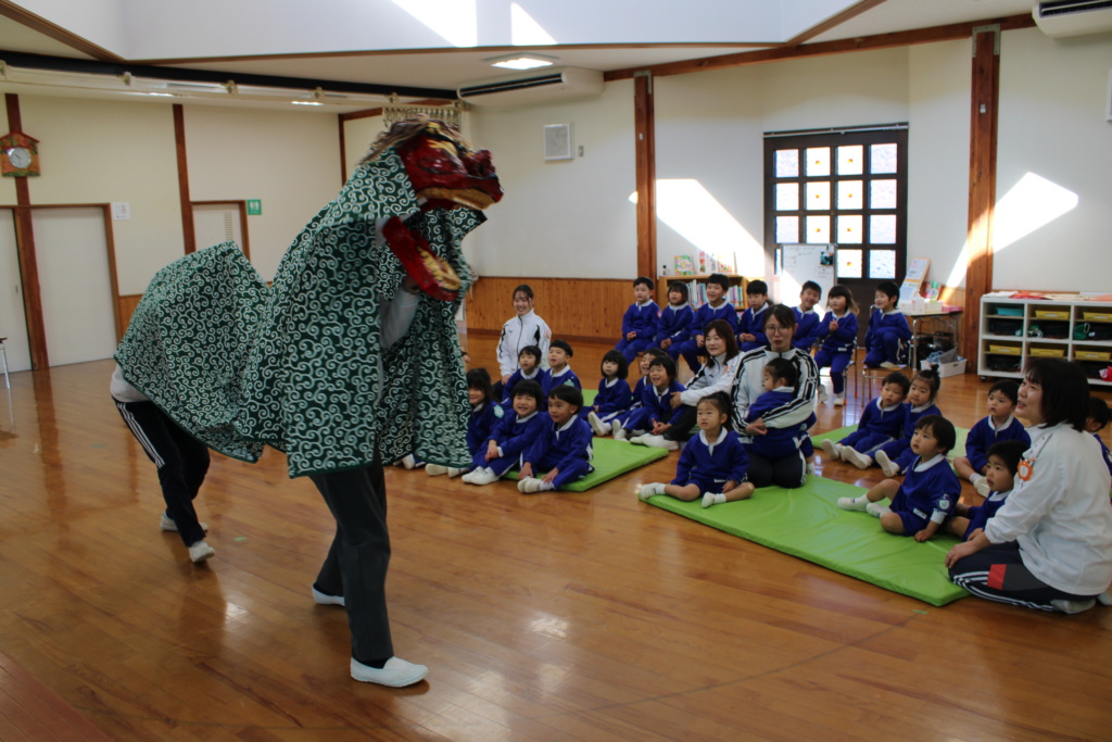 1月のお誕生会では、職員が獅子舞を披露しました。獅子は、神様の遣いと言われ、その怖い顔と歯で邪気を払うとされています。そうできるように威厳のある顔の獅子を職員で手作りしてきました。当日は、子ども達に獅子舞の意味を伝えた後に、職員2人が中に入り、みんなの健康と幸せを願って舞いました。終わった後、2歳以上児(怖くない子)は頭を噛んでもらいました。午年ということで馬屋下のみんなが一層活躍できる年になればと思います。