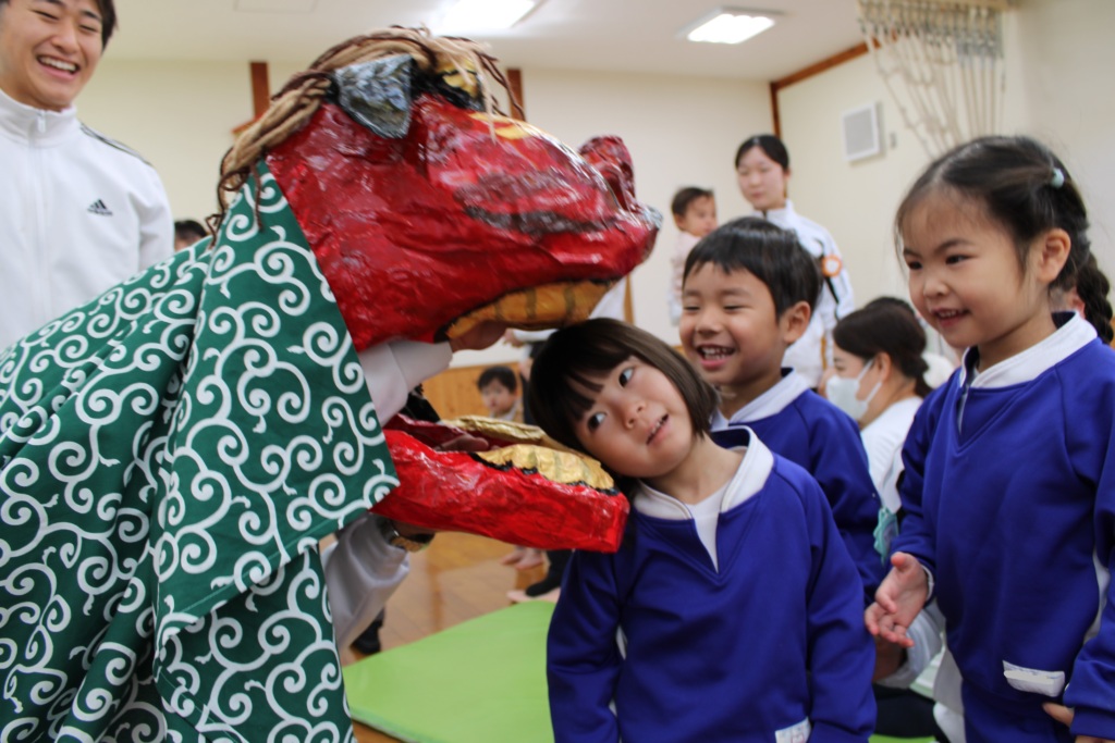 1月のお誕生会では、職員が獅子舞を披露しました。獅子は、神様の遣いと言われ、その怖い顔と歯で邪気を払うとされています。そうできるように威厳のある顔の獅子を職員で手作りしてきました。当日は、子ども達に獅子舞の意味を伝えた後に、職員2人が中に入り、みんなの健康と幸せを願って舞いました。終わった後、2歳以上児(怖くない子)は頭を噛んでもらいました。午年ということで馬屋下のみんなが一層活躍できる年になればと思います。