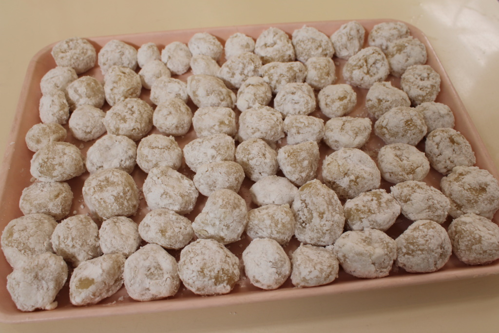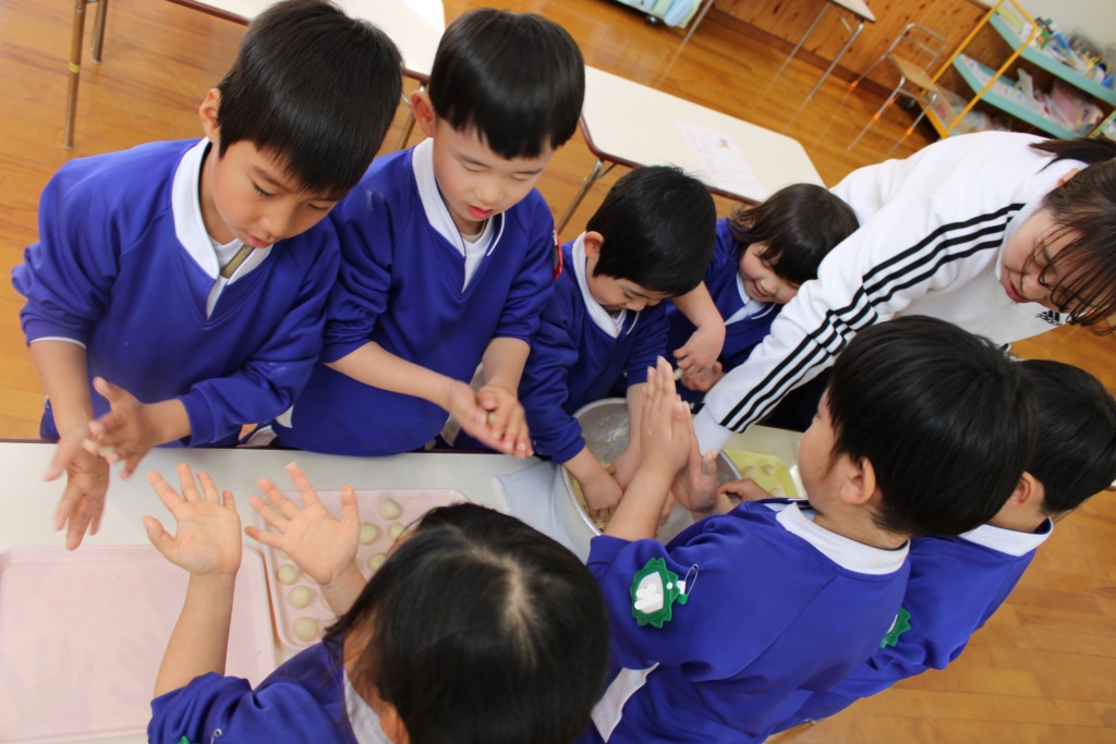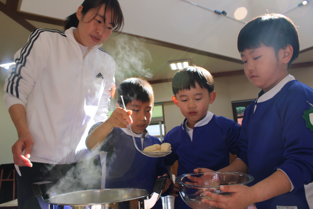 音楽会が近づいてきた1月23日。桃太郎の世界をワンダーパワーを使って楽しんでもらおうと、4・5歳児で実際に“きびだんご”を作りました。もちきび粉、だんご粉、砂糖を混ぜた後、少しずつ湯を入れながらこね、可愛いらしいまんまるのお団子をたくさん作りました。お鍋に入れると、初めは底に沈んでいたお団子が浮き上がってきて完成!もちとりこをまぶして食べやすくしました。
