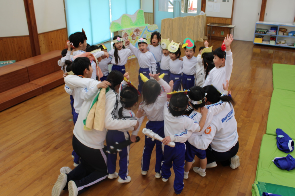プログラムの最後は、3クラス合同で行う劇遊び「ももたろう」です。遠足をきっかけに岡山の桃太郎伝説を知った4・5歳児。そこから「ももたろう」の昔話にはまり、廃材で桃太郎のハチマキを作ったり、犬の耳を作ったりして遊ぶうちに、役になりきって遊ぶ姿がみられるようになったことから劇遊びへと発展しました。