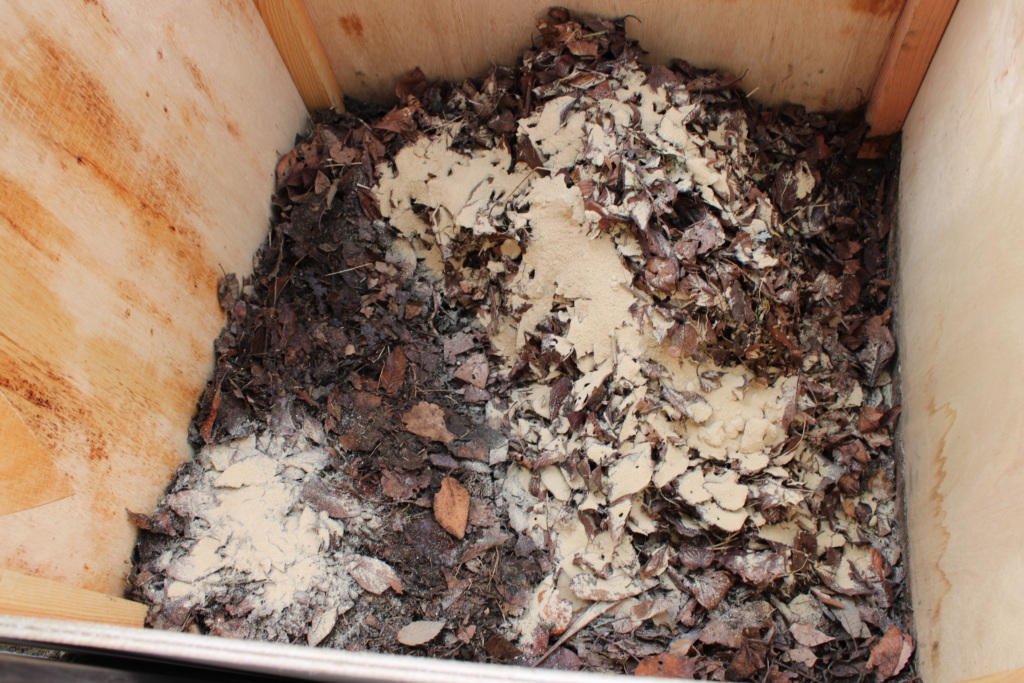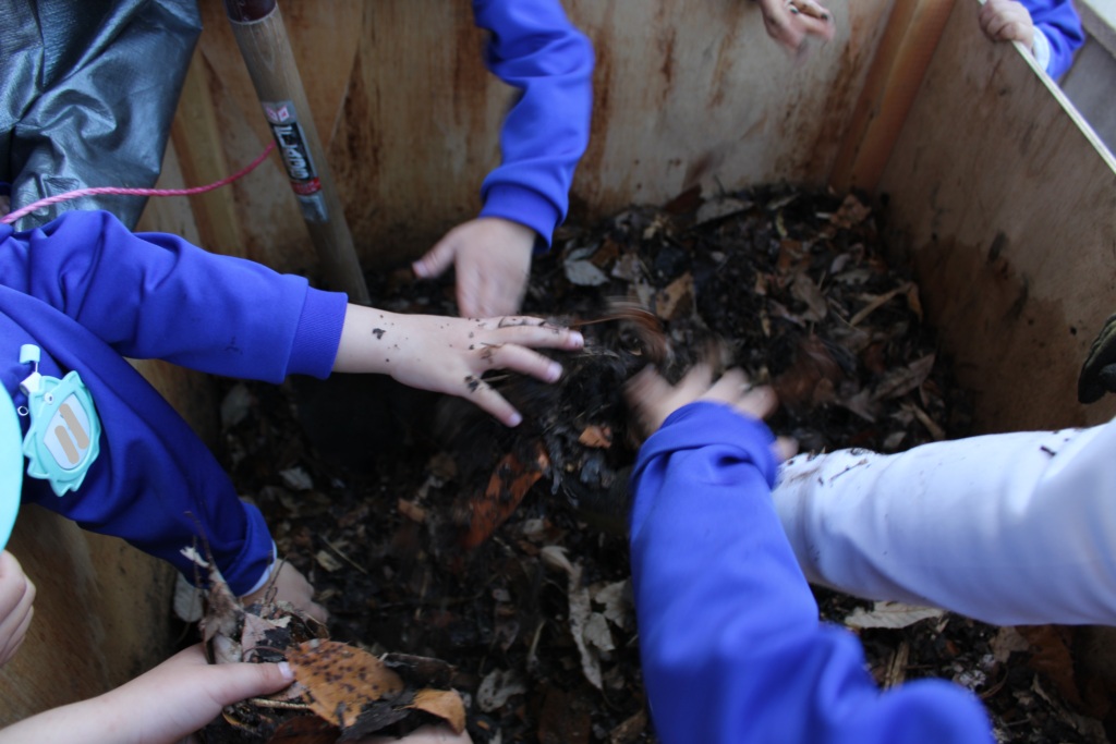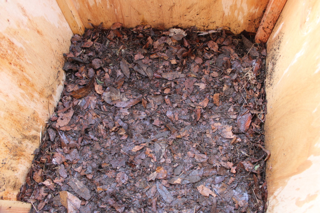 2月16日、蓋を開けて子どもたちと中の様子を見てみました。中の状態はこんな感じ。表面は少し乾き気味。でも中の方に手を入れてみると…「ん?あったかい!」「なんかあったかいね!」とワンダーパワーを使って気づいた子ども達。おそらく発酵が上手くいっているんだと思います。そして、匂ってみると…「カブトムシ(の土)の臭いだ!」と多くの子が言っていました。カブトムシの土同様に栄養のある腐葉土になっていってくれたら嬉しいです。
