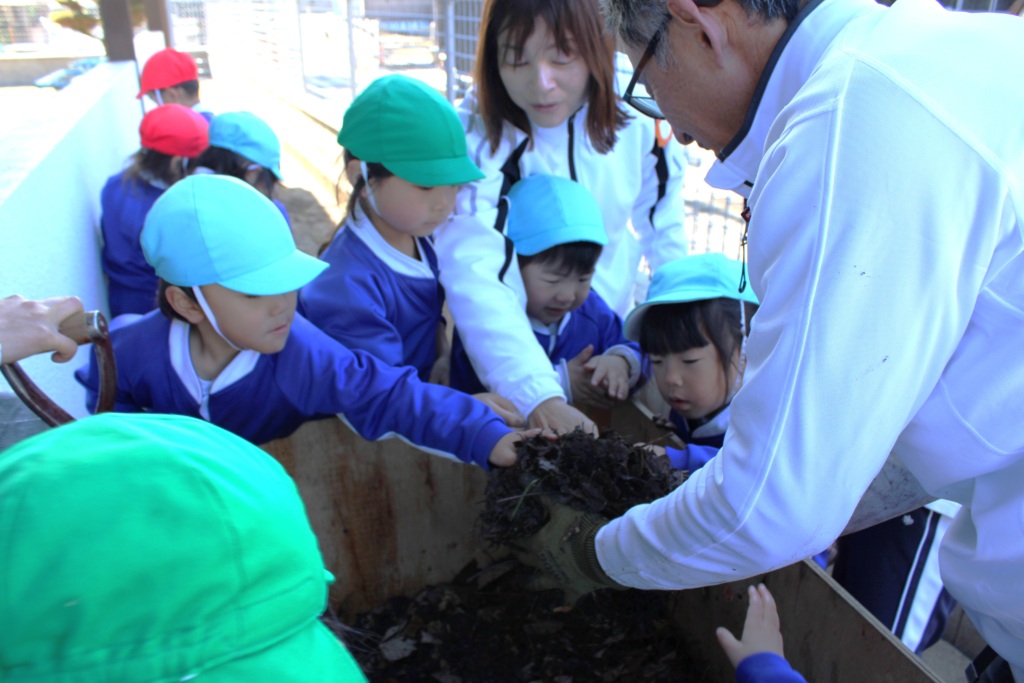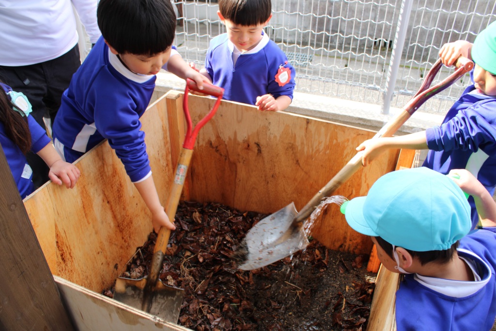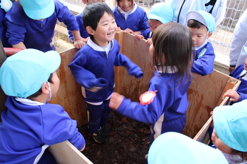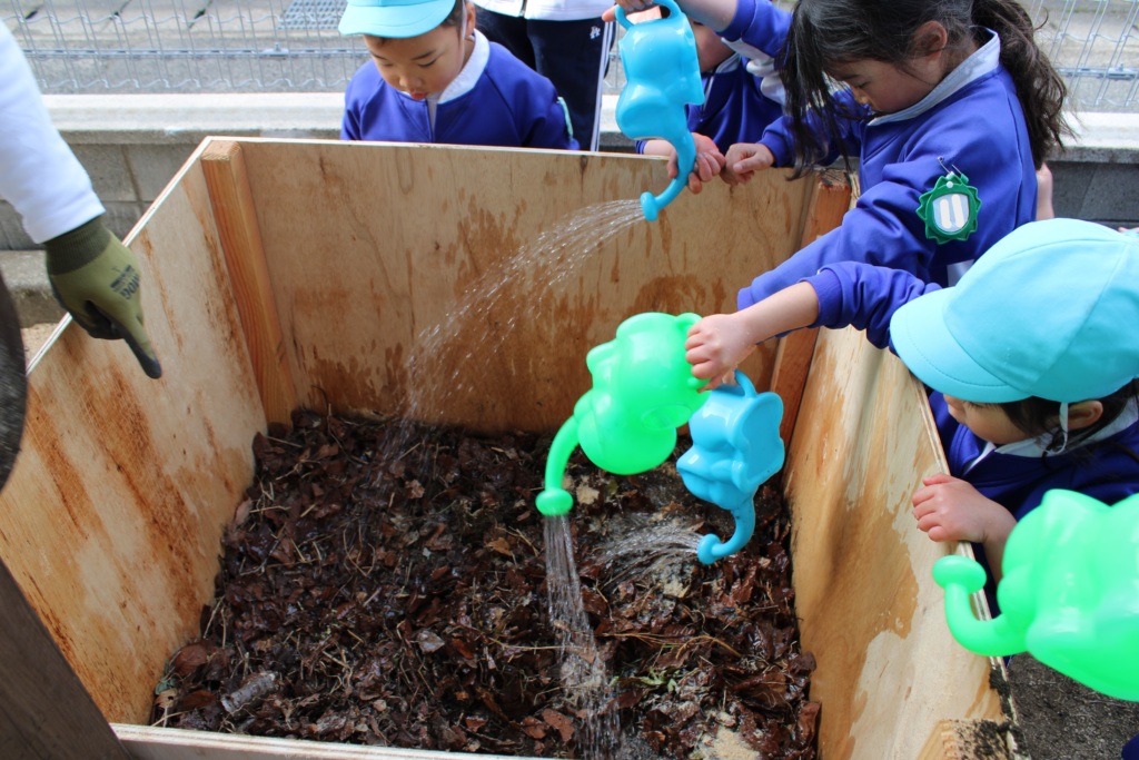2月10日、子どもたちが一生懸命集めた葉っぱと保育者が追加で集めた葉っぱを使って土づくりの開始です。コンポストに葉っぱを入れます。葉っぱが土になるには目に見えない微生物の力で、発酵する必要があります。発酵を促進するために加えるとよいと言われている米ぬかを振りかけます。微生物をさらに加えるために畑の土を少々加えます。そして、葉っぱ全体が程よく濡れるようにジョウロで水をかけます。子ども達は“本当に土ができるの?”と興味深そうに、これらの作業を繰り返してくれました。そしてこれらを3回繰り返したのち…