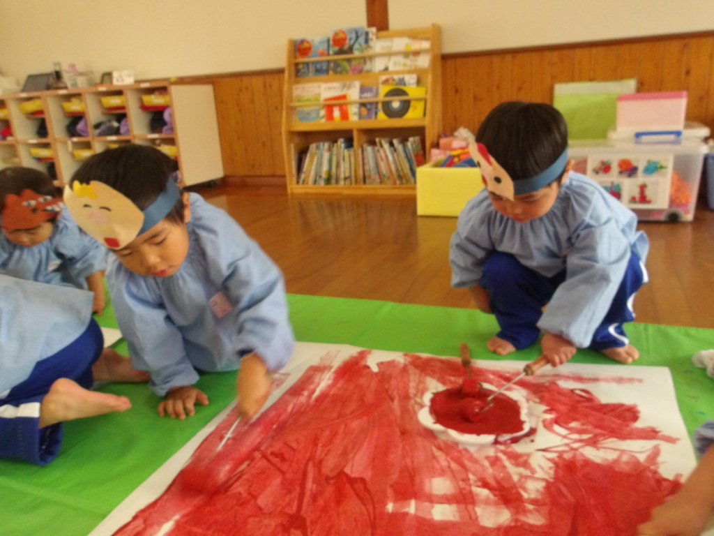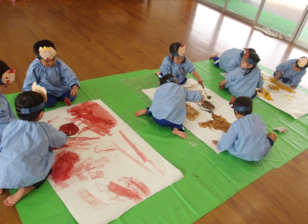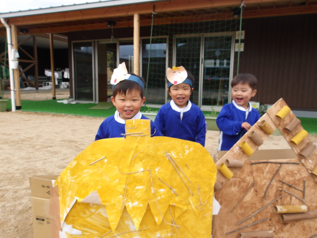 お面とお家が完成し、戸外で引越しゲームやむっくりオオカミさんなどの集団遊びを楽しむ中で、子ども達の方から自然と言葉のやり取りや歌が聞こえてきました。また「おれさまは、はらぺこオオカミだ。なかにいれておくれ」「ダメダメ!ぜったいいれないよ」と役になりきって、セリフを言ったり、「♪オオカミなんかこわくない、こわくない~」と歌をうたったりして、劇ごっこも楽しむことができました。