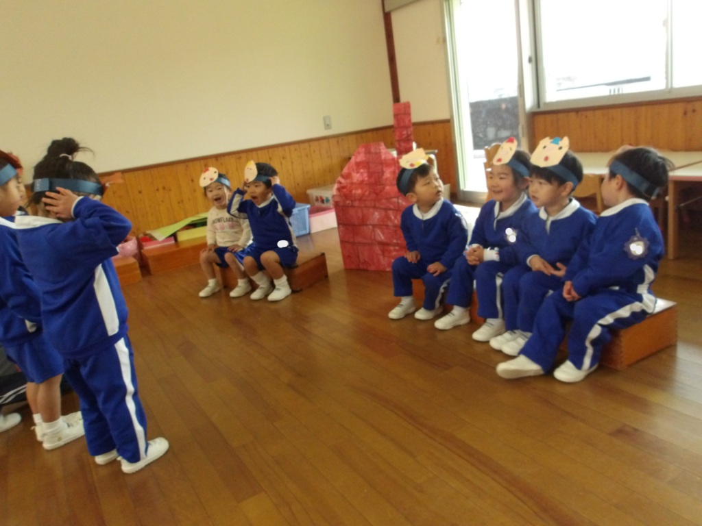 2月に入ってから、「オオカミと七ひきのこやぎ」や「てぶくろ」、「ももたろう」などの様々なお話に触れてきた子ども達。その中でも一番のお気に入りは、「三匹のこぶた」でした。オオカミが登場する場面になると、「こわいね…」と言って、友達と身を寄せ合ったり、オオカミが家を吹き飛ばす場面では、「ふーふーのふー!」と一緒にセリフを言ったりして楽しむ姿が見られました。