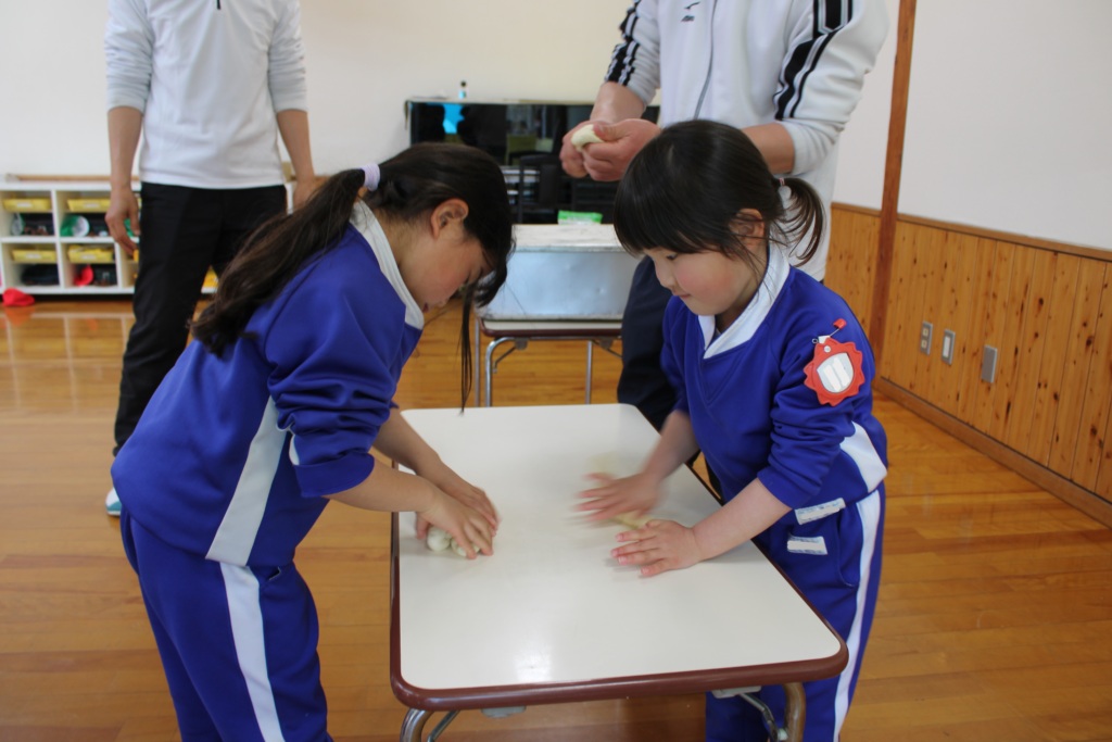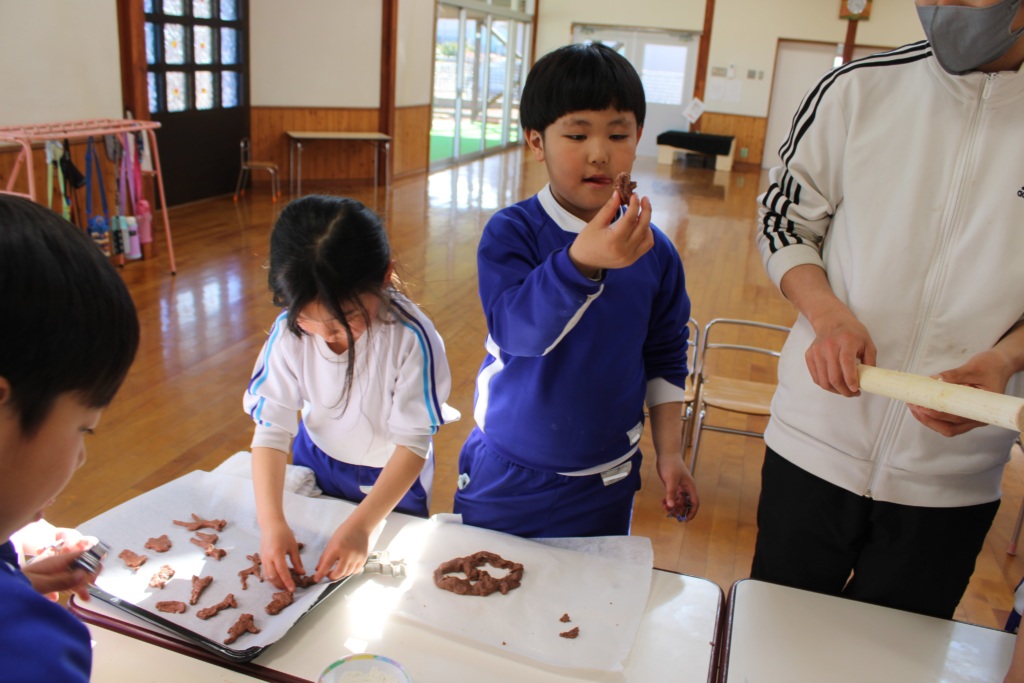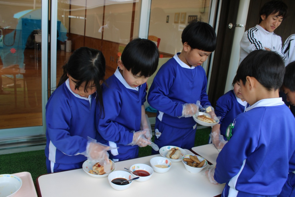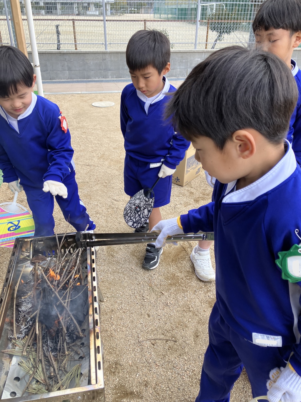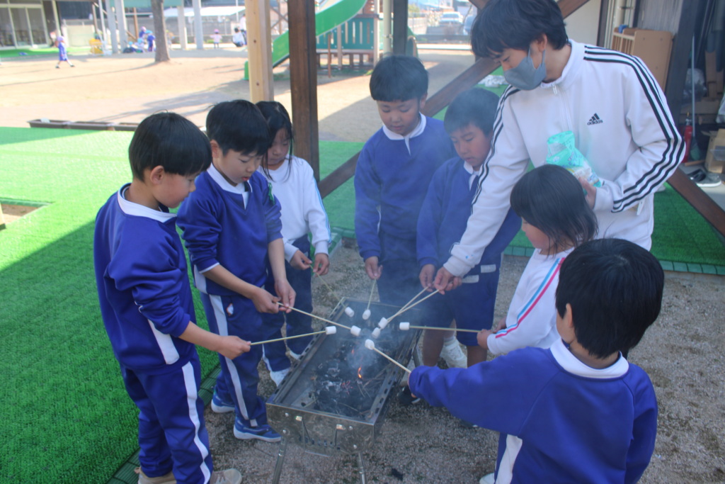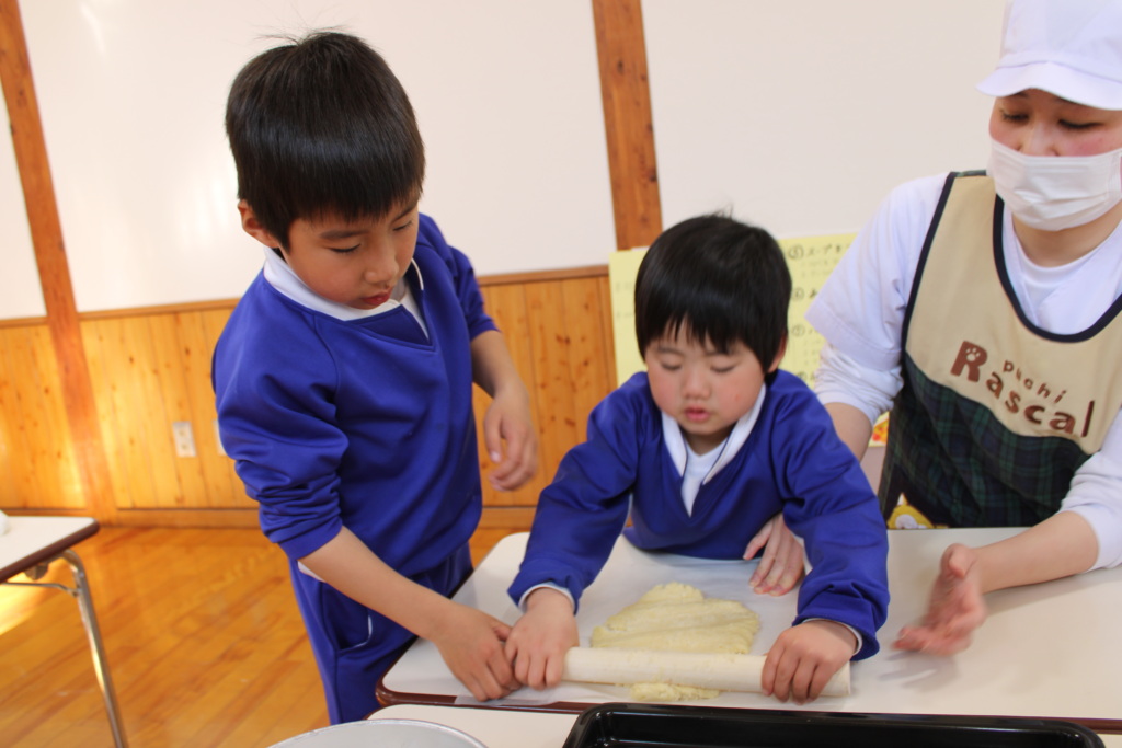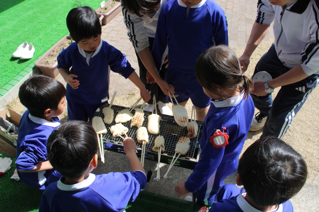 食べて片付けをした後は室内のロープで遊び、午後のおやつクッキーを給食の先生と一緒に作りました。生地を伸ばし、型を抜くのは意外と大変。給食先生のいつもの苦労が身に沁みました。クッキーと共にバーベキューコンロであぶったマシュマロも食べました。どちらもいい感じに焼けて、ほっぺたが落ちそうでしたよ。