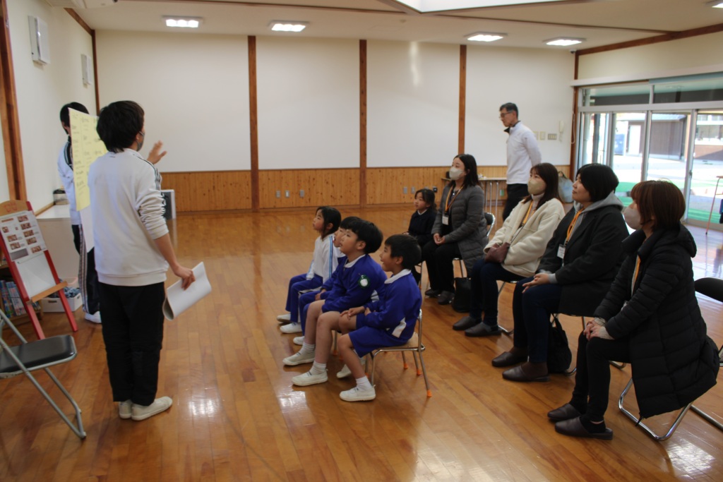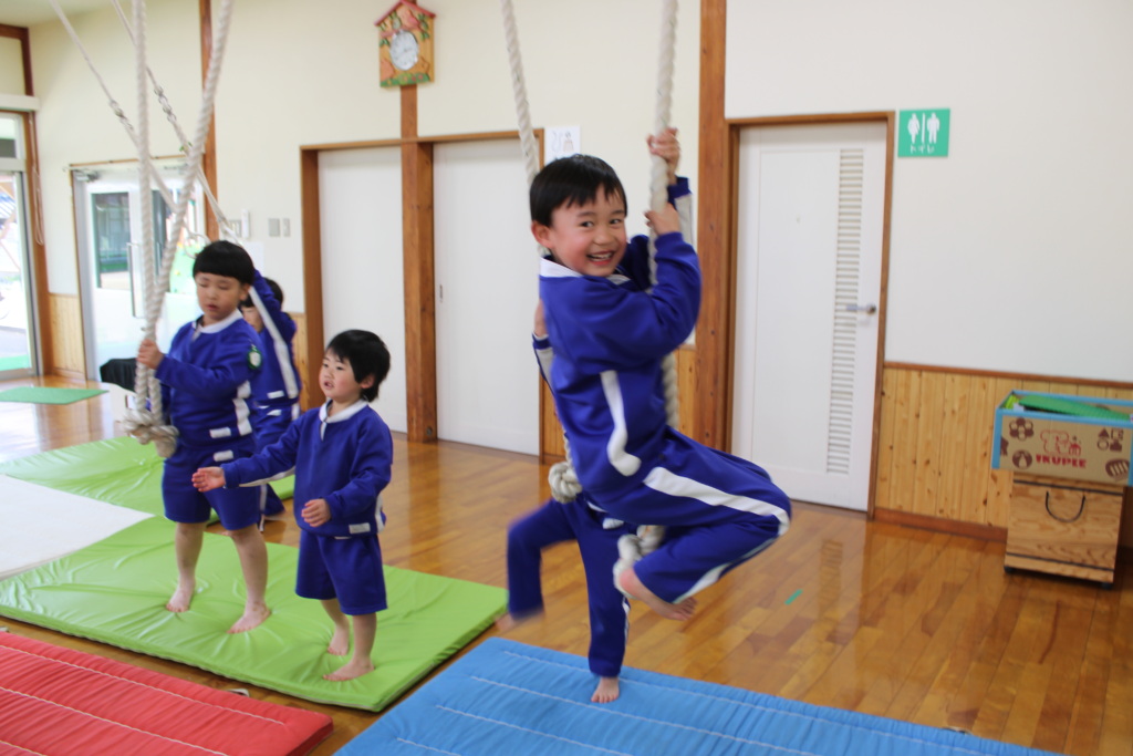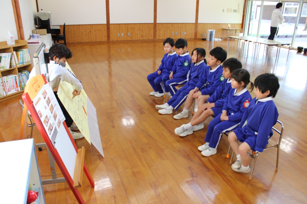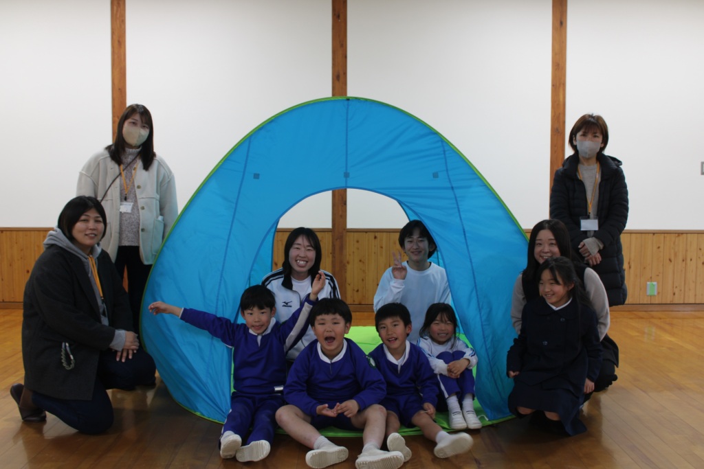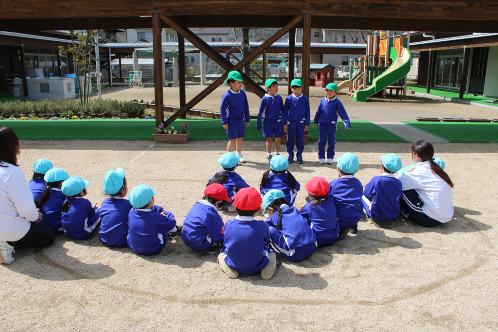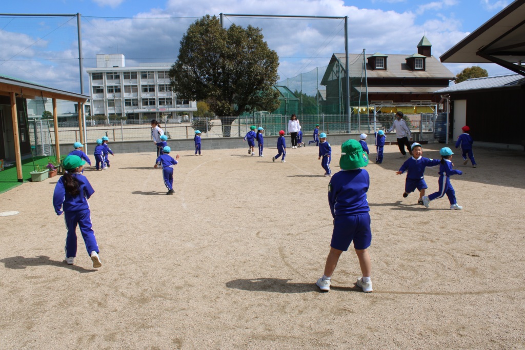 ここまでできたら一段落。次は子どもたちがしたい遊びの時間!3歳児さんと一緒にレンジ鬼をしたいということで、5歳児の4人がルール説明から進行役まで行いました。以前1年生との交流で見た1年生の姿が子どもたちの手本になっていたのかもしれません。元気いっぱい体を動かして、ルールを楽しみながら遊ぶことができました。
