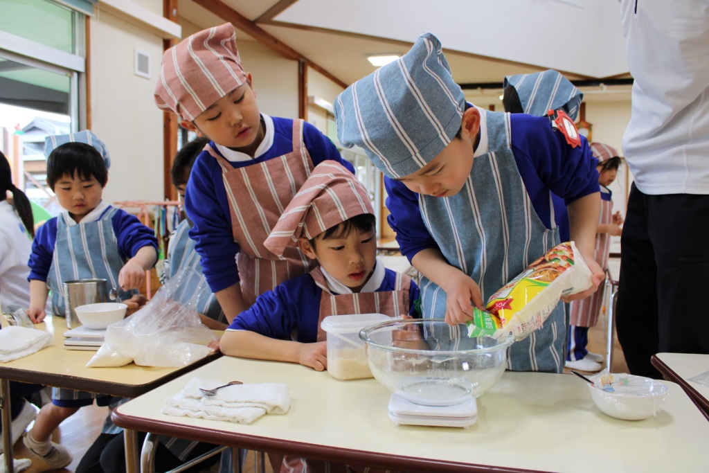 そして、段取りよく、昼食準備に取り掛かりました。子どもたちが考えたメニューは、手作りパンのホットドッグ、園で栽培した野菜のスープ、骨付き肉です。パン生地の仕込みはペアを作って行いました。これまで何度もやってきたパン作りですが、分量を量るところからするのは初めて。書かれている分量を読み、分量通りの量を入れるのは微調整が必要なためとても難しいことに気付いたようです。