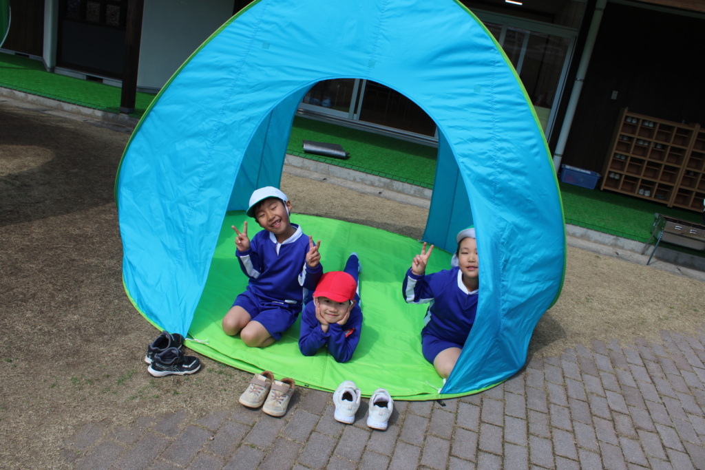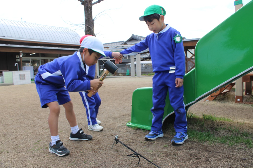 3月10日、卒業を控えた5歳児クラスと、いつも一緒に生活している4歳児とでデイキャンプを行いました。もともと夏頃から天然芝の園庭を生かしてキャンプごっこをしたいねという話をしていたのですが、酷暑のため実施を延期していました。そこで、卒業前のこのタイミングで園生活で培ってきた知識・技能・体力・思考力等をフルに使い、園生活の集大成として、子どもたちが主体となって一日の生活を創ることを目的にデイキャンプを実施しました。