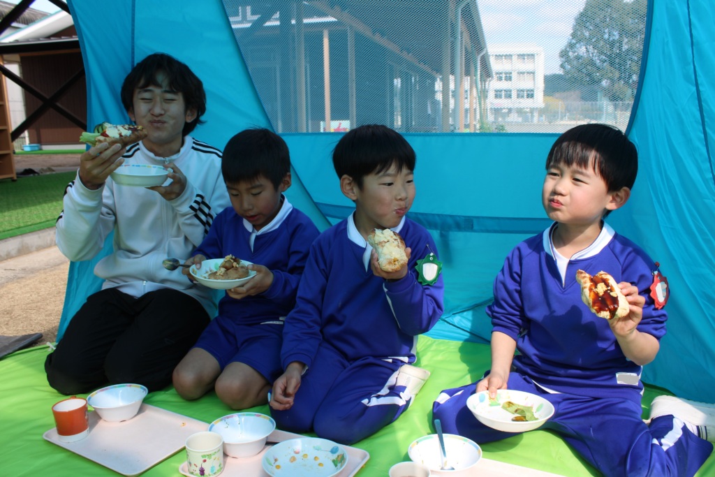 パン生地は火を起こしたバーベキューコンロとオーブンで焼き、できたパンに子どもたちがチョイスした具材の好きな物を挟んで完成!スープと骨付き鳥と共にみんなでテントの中でキャンプ気分を存分に味わいながらいただきました。味は?もちろん、「最高~‼」