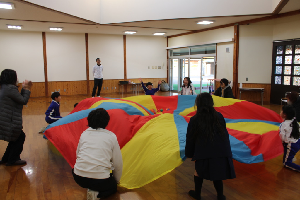 片付けが終わると、全体での活動は終了。5歳児はここから保護者の方に来てもらい、1年間の園生活やデイキャンプの振り返りを行い、最後に運動会でしたパラバルーンを保護者の方も一緒に行いました。最後にバルーンの上の球を花火のように上げる技は、運動会でも完璧には成功しなかった大技ですが、保護者の方とも息が合い、きれいに上がって大成功!みんな大喜びでした。