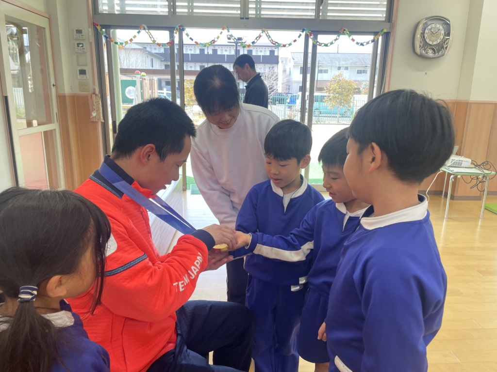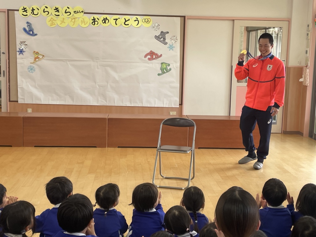 ミラノ・コルティナ冬季五輪でスノーボードビッグエア金メダリストの木村葵来選手(御南保育園 卒園児)が母園に凱旋来園され、姉妹園である馬屋下まんまるこども園の5歳児は会いに行かせていただきました。